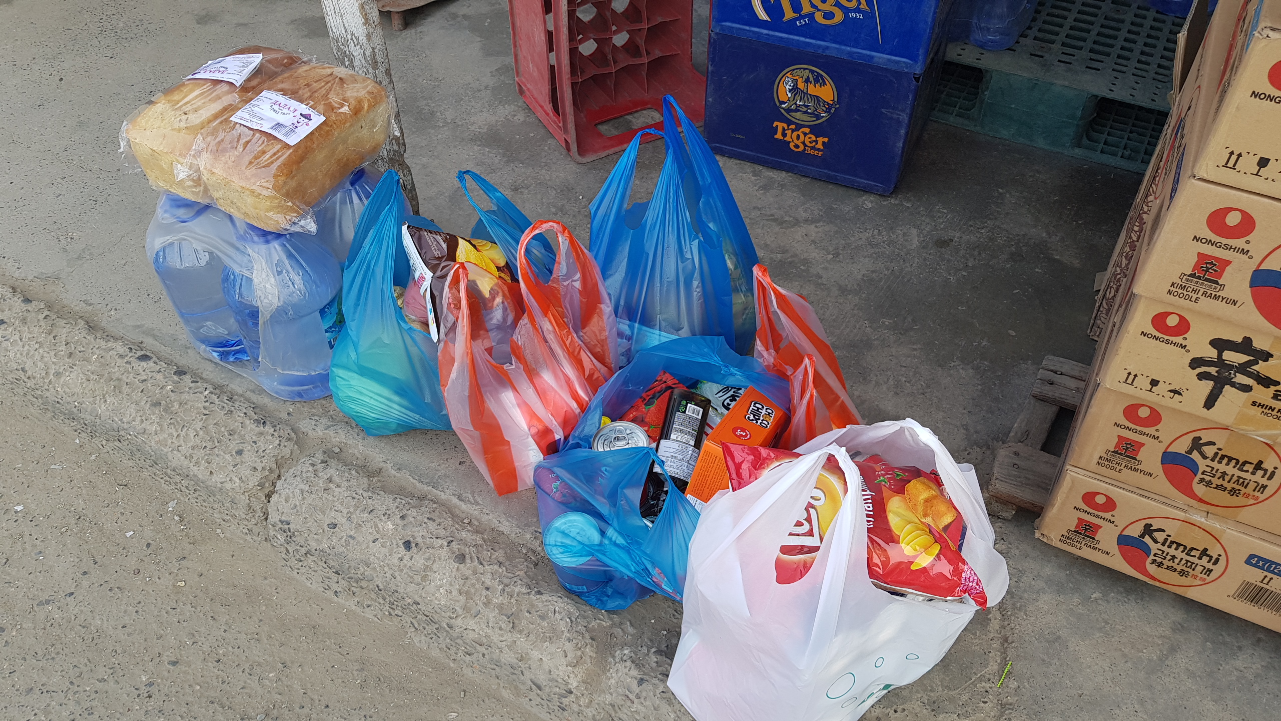 Pour 10 jours, nous achetons de quoi survivre (bien survivre) : 5 kg de pâtes, 4 kg de riz, des bananes, des pommes, des légumes (carottes, patates, oignons, brocoli, gingembre, salade, courgette, concombre…), sauces, snacks, pain, quelques produits d’hygiène, de l’eau et des bières !