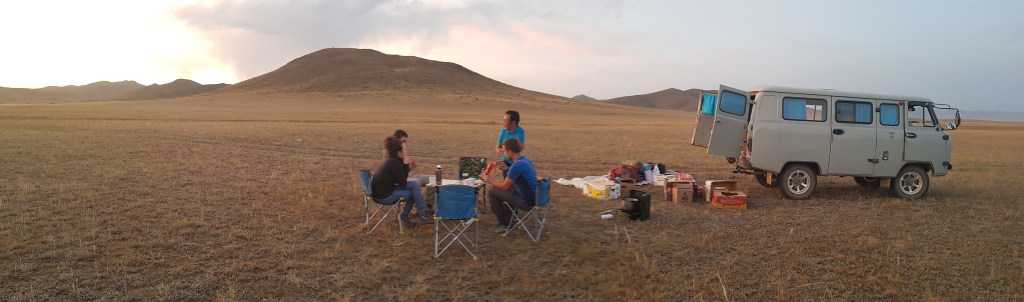 Nous mangeons tranquillement dans la yourte pendant que les guides sont à côté dans le van en train de boire de la vodka et de fumer.