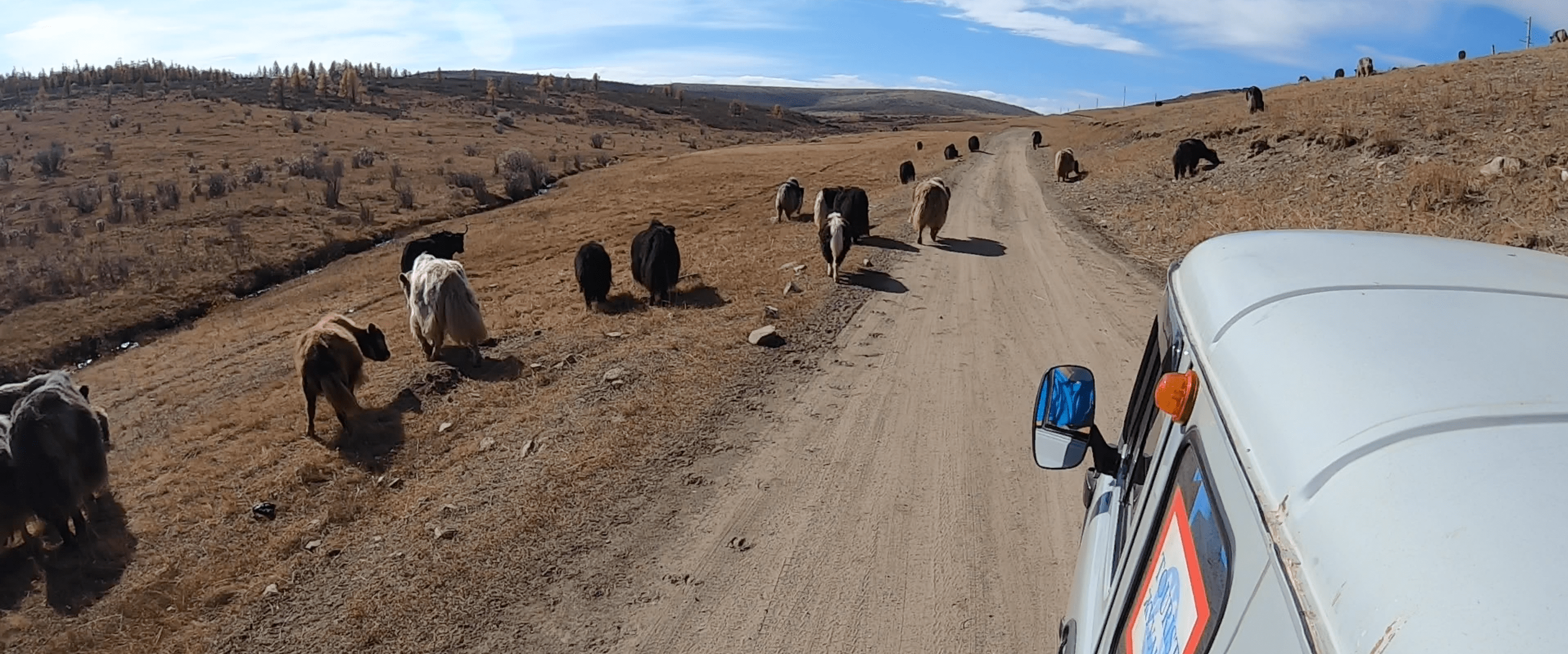 3e jour, une courte route nous mène au lac Khövsgöl. Le lac apparaît au loin d’une couleur bleu intense. Les yacks bordent les routes et les plages.