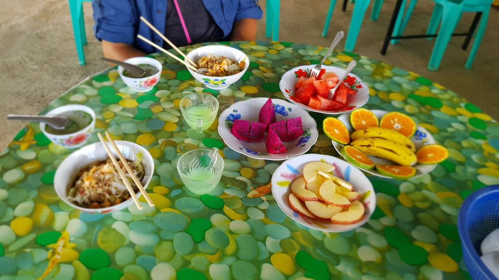 Il nous sert un jus de melon pour patienter. Puis un bol de nouilles accompagné d’assiettes de fruits en tout genre : pomme, orange, banane, fruit du dragon…