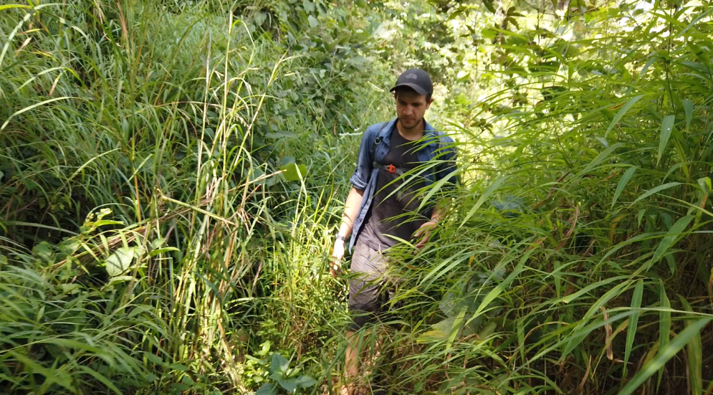 Nous marchons 3h le matin. La première partie du trek se fait dans la forêt à travers la broussaille. Ici rien n’est taillé, nous poussons la broussaille pour se frayer un chemin.