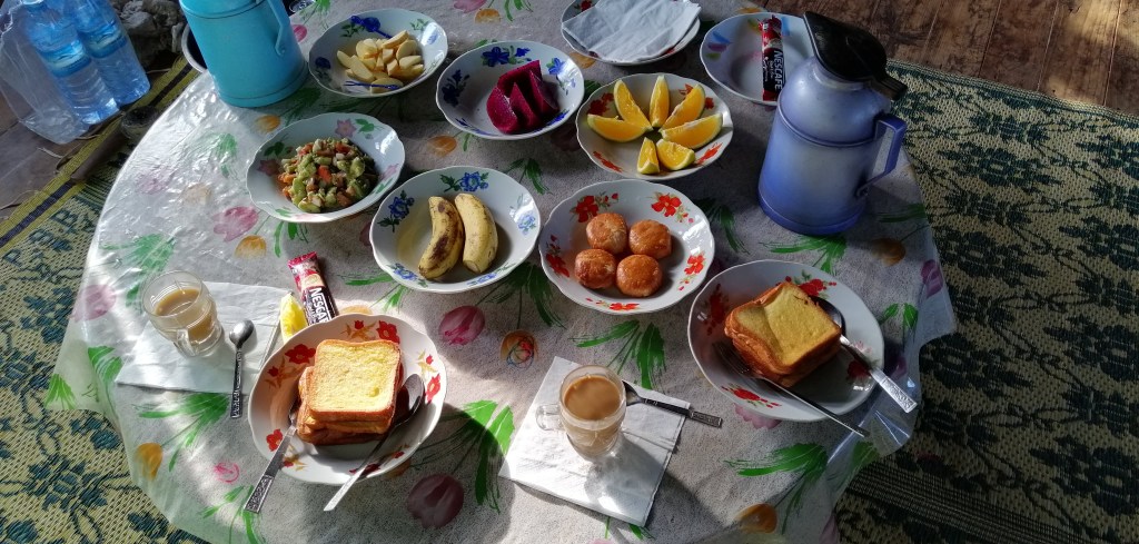 Nous nous levons vers 7h. Nous avons droit à un festin pour le petit-déjeuner : french toast, guacamole, banane, pomme, orange, fruit du dragon, … que du frais.