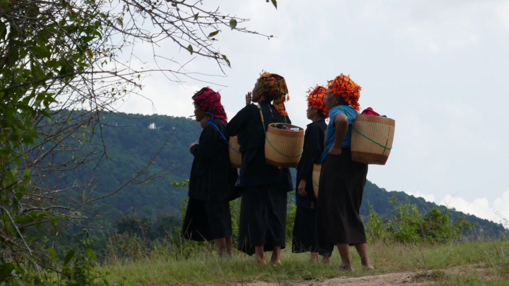 Nous faisons un bout de chemin auprès de 4 femmes, turban sur la tête, panier dans le dos, longyi, et tong.