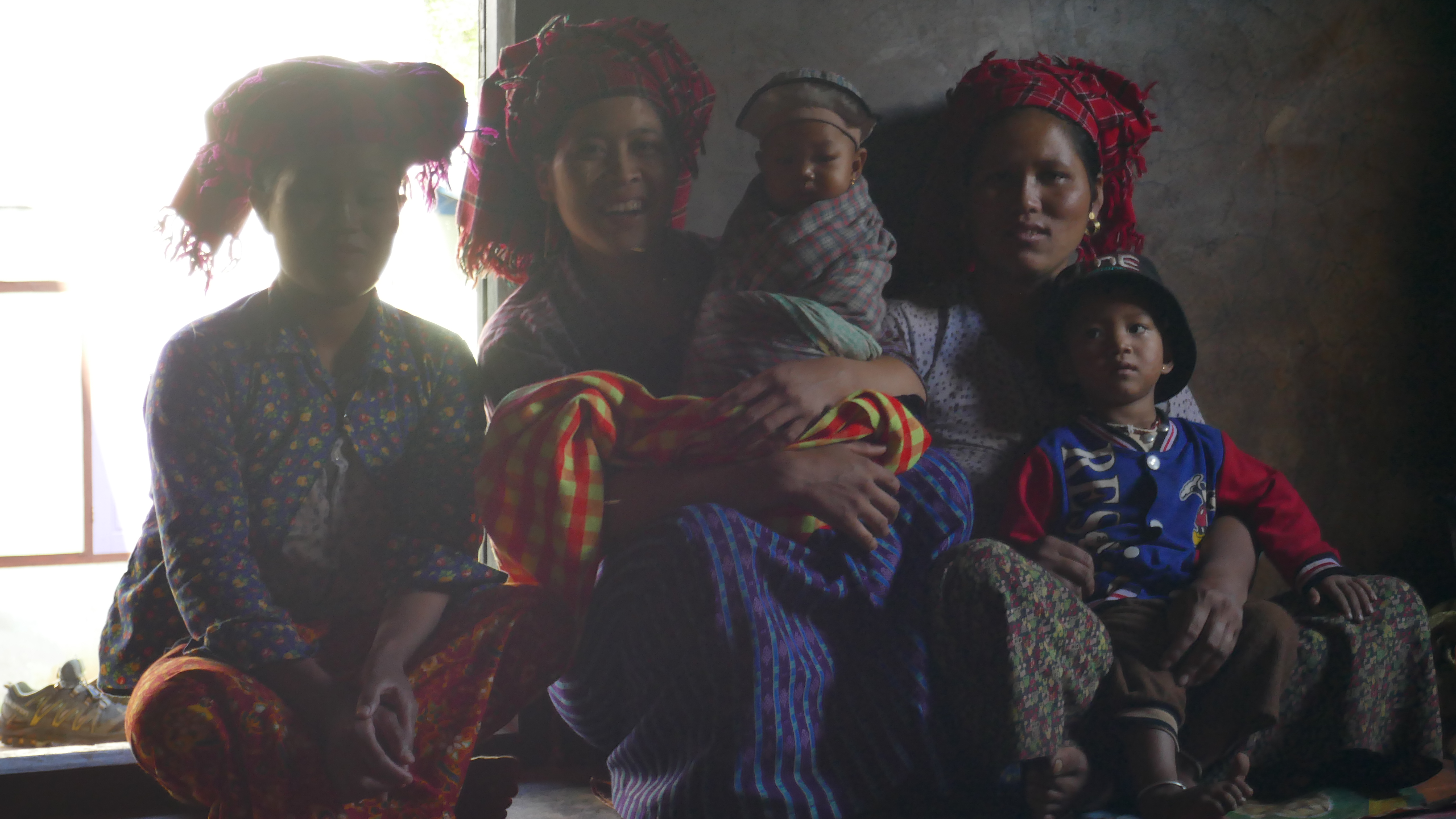 Il y a un homme avec son fils de 2 ans et demi, et plusieurs femmes avec un turban sur la tête de différents âges. Elles sont réunies ici pour le thé. Nous nous retrouvons auprès de 6 ou 7 femmes. Certaines passent à la fenêtre pour voir ce qui se passe.
