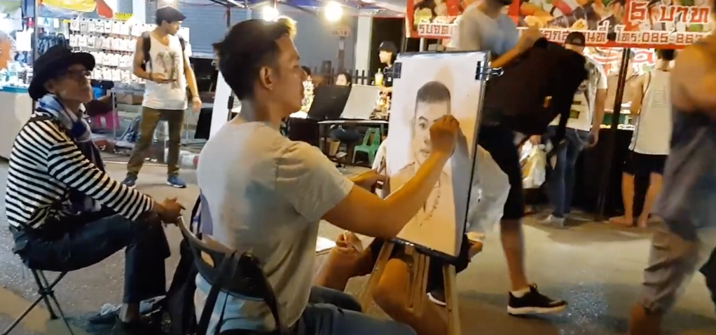 Le marché est animé par des artistes ambulants : dessinateurs, musiciens, chanteurs (dont la plupart ont un handicap).