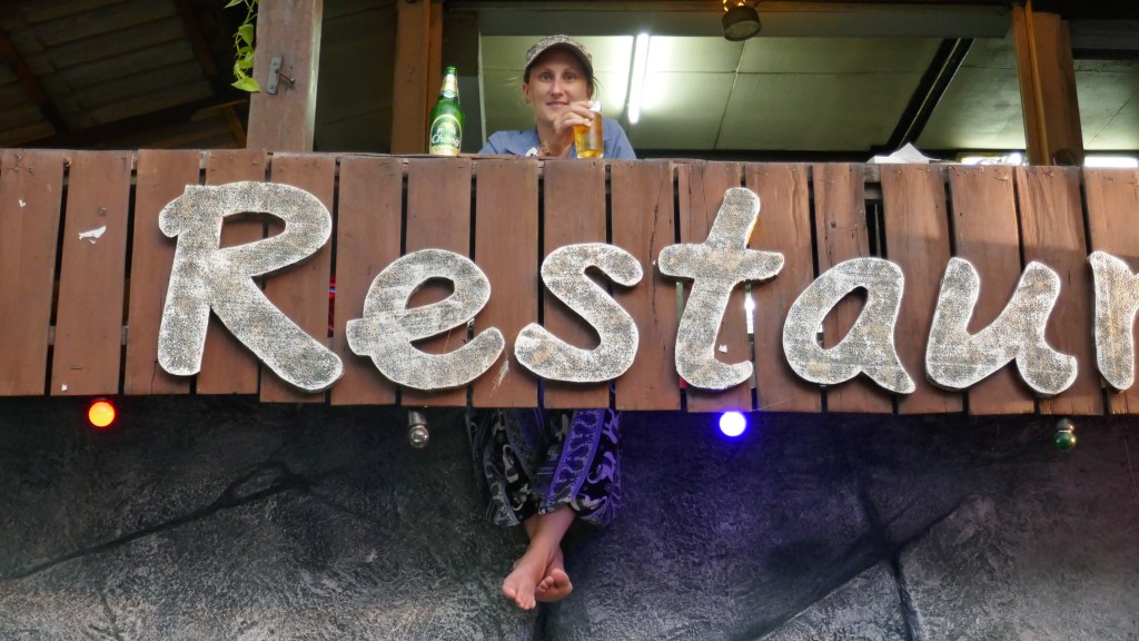 Nous passons devant un bar restaurant où les gens sont assis avec les pieds dans le vide. Banco ! On s’arrête ici une petite heure pour une bière Chang de récup.