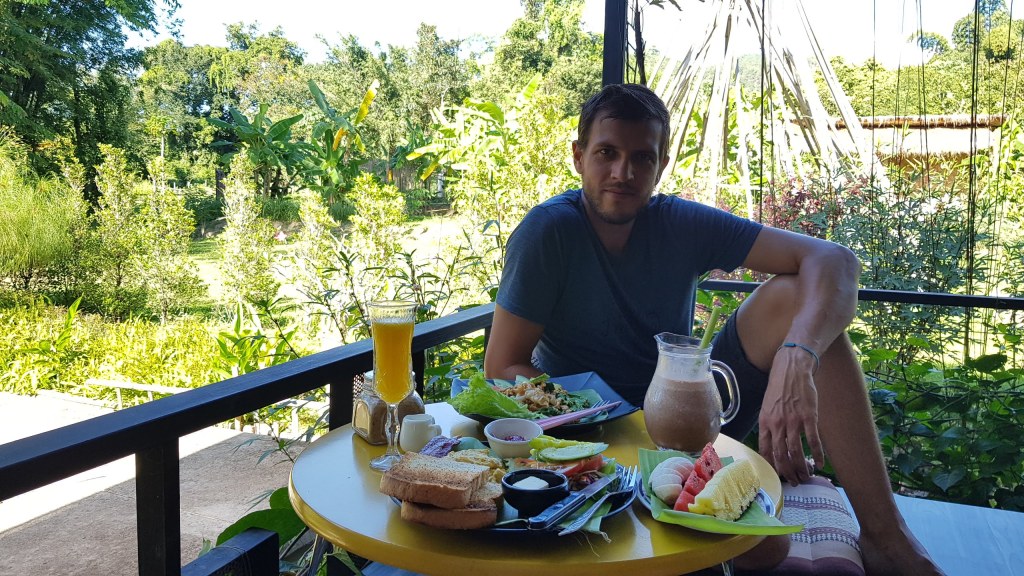 Nous nous installons pour un bon petit dej : american breakfast avec café, omelette, salade de crudités, bacon, salade de fruits, smoothie passion… Un vrai régale dans un cadre paisible.