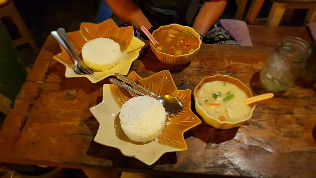 Ce soir, nous allons tester un petit restaurant local bien noté, le two sisters, qui s’avérera devenir notre cantine du coin. Le restaurant est tenu par une famille Birmane, très accueillante. Nous sommes accueillis avec deux verres en bambou remplis de glaçons et de l’eau fraîche.