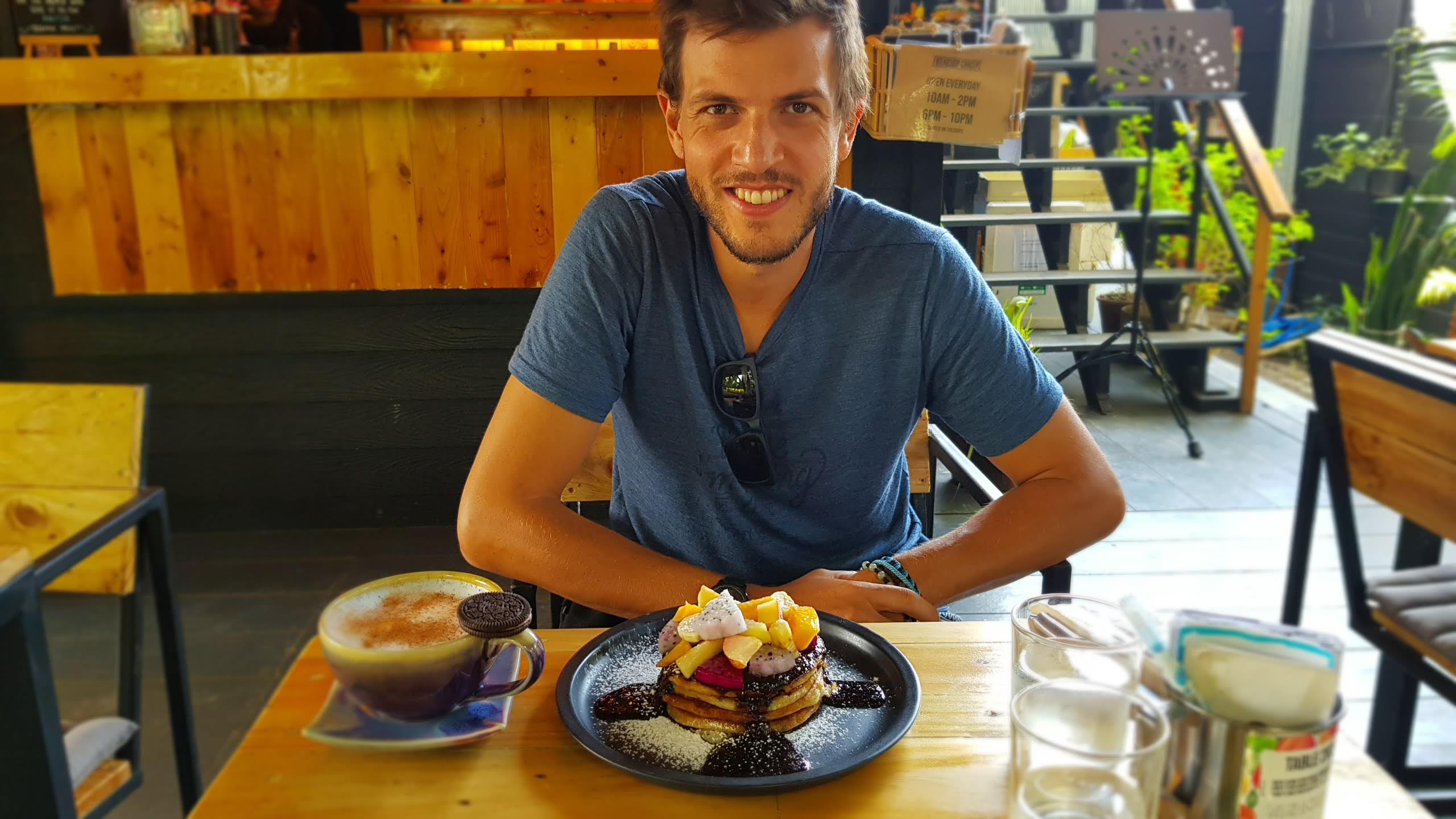 Vers 11h, on démarre la journée par un bon petit dej au Two sisters : Pancake banane chocolat, cappuccino et toujours la petit assiette de fruits offerte.