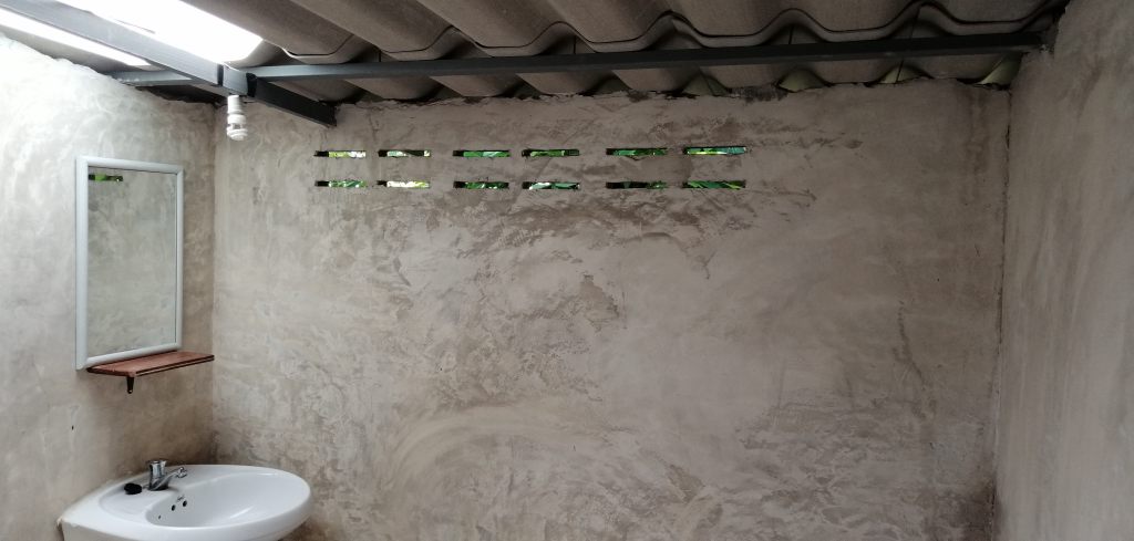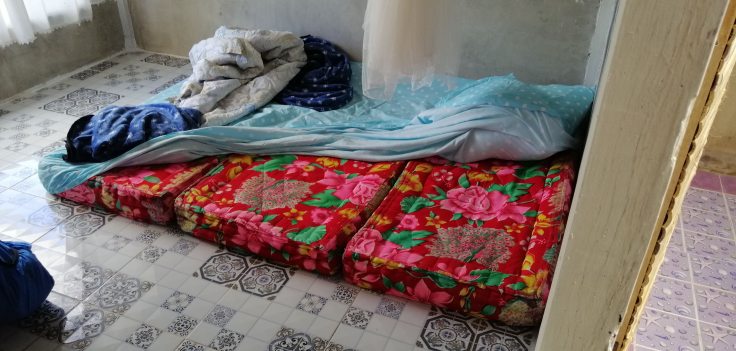 La chambre est plus que sommaire : de petites cabanes pas finies, des trous dans les murs et fenêtres, aucun meuble, les murs sont à peine finis… même pas de lit. Par terre, un matelas au sol qui s’avère être en fait 3 morceaux de coussins assemblés. Impossible de s’installer convenablement pour 6 jours.