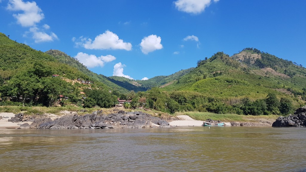 Pendant un certain temps nous longeons la border line, naviguant entre Laos et Thailande. Puis, la côte thaïlandaise s’efface peu à peu jusqu’à disparaître totalement et laisser place au Laos.