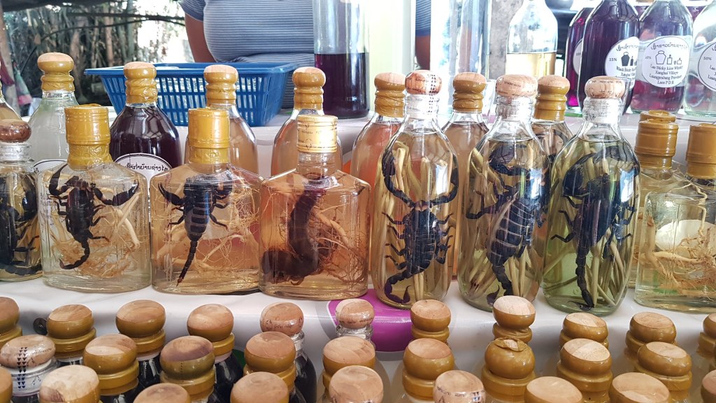 Sur l’étalage, de petites bouteilles d’alcool avec des scorpions à l’intérieur.