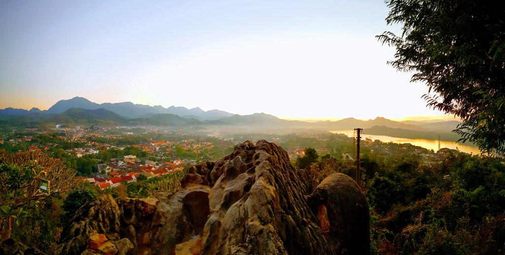 Nous souhaitions grimper en haut de la colline à la PhouSi Mountain pour y voir le coucher de soleil. Comme à notre habitude nous sommes en retard et le soleil est déjà passer derrière les montagnes. Nous tentons quand même notre chance, et grimpons les 300 marches qui nous séparent du sommet à vive allure.
