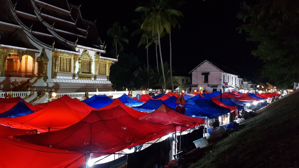Nous sortons le soir pour faire un tour au night market. Plutôt petit, assez calme, les stands proposent de nombreux produits artisanaux plutôt bien finis, mais aussi de nombreux, très nombreux vêtements pour enfants. Cela nous surprend par rapport à la Thaïlande. Nous flânons quelques temps dans les allées avant de retourner à l’hôtel.