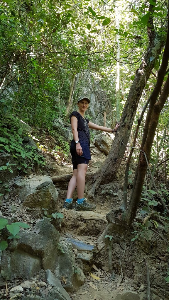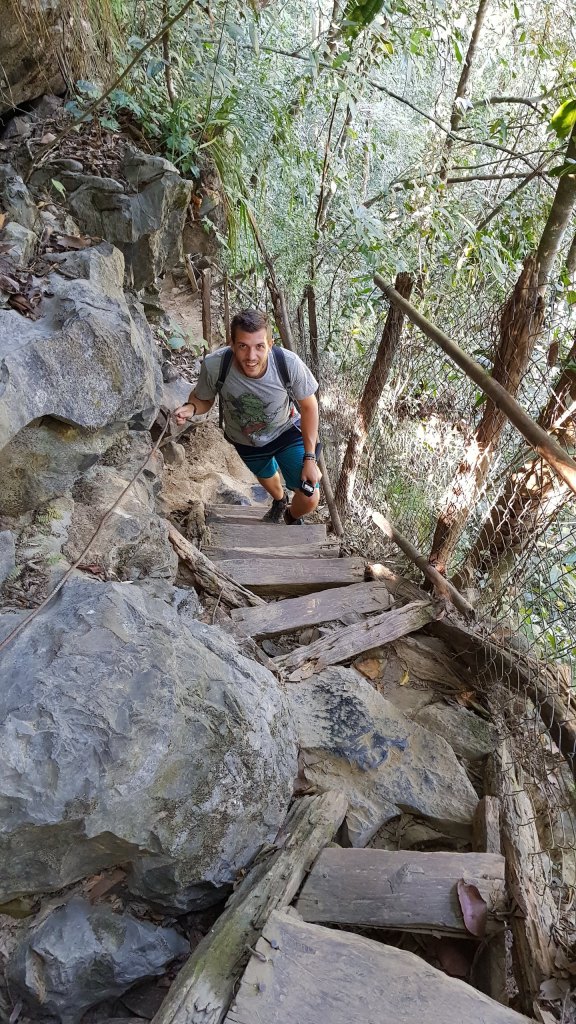 Au bout d’à peine 5 minutes, ça se corse déjà. Il est parfois nécessaire de mettre les mains pour grimper. Nous grimpons tout de même à bonne allure. Les panneaux indiquant la distance restante jusqu’au sommet se succèdent. Enfin, parfois, ils indiquent la distance jusqu’au sommet et parfois la distance parcourue, ce qui est un peu déroutant. A mi parcours, une petite hutte en bord de falaise laisse place à une superbe vue. Nous en profitons pour y faire une petite pause.
