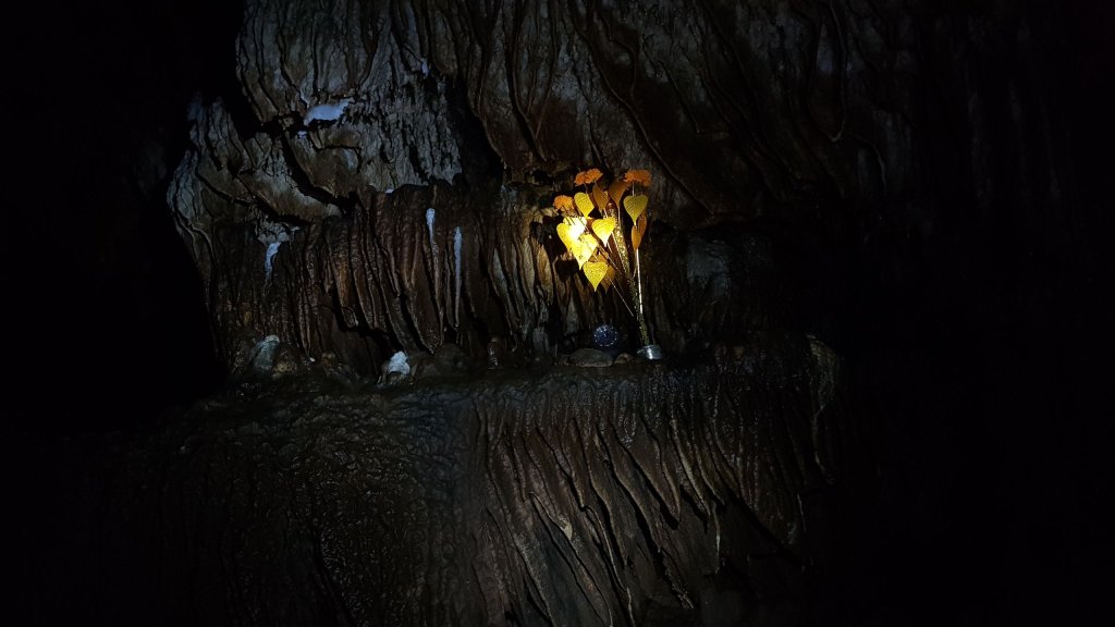 Après près d’1km, nous arrivons aux grottes de Snail Cave et Loup Cave. Et hop, encore un droit d’entrée de 10 000 kips. Ils nous fournissent les lampes torches pour la visite. Bon, au final, elles sont pourries, donc nous utilisons les nôtres. Nous sommes à nouveau tout seul à partir à l’exploration des bas-fonds. A l’entrée, un grand bouddha nous accueille, comme une protection pour la visite.