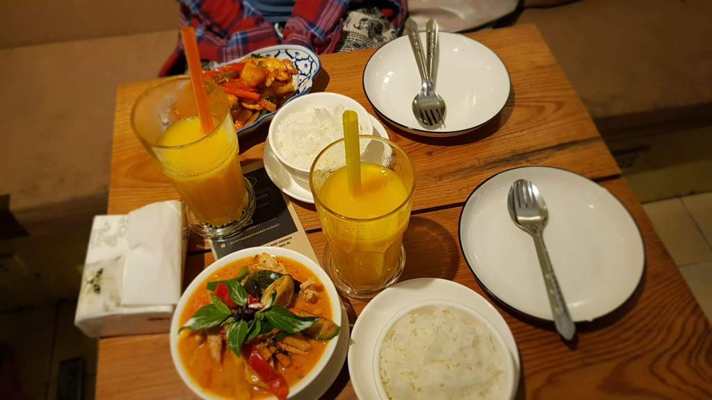 De retour en ville, nous ressortons pour un bon resto après toutes ces aventures. Nous allons au Happy Mango. Un bon shake à la mangue, un bon plat thai (Red Curry pour Francois et Poulet Aigre douce pour Sarah), nous sommes bien calés et pouvons retourner à l’hôtel après une longue mais fantastique journée.