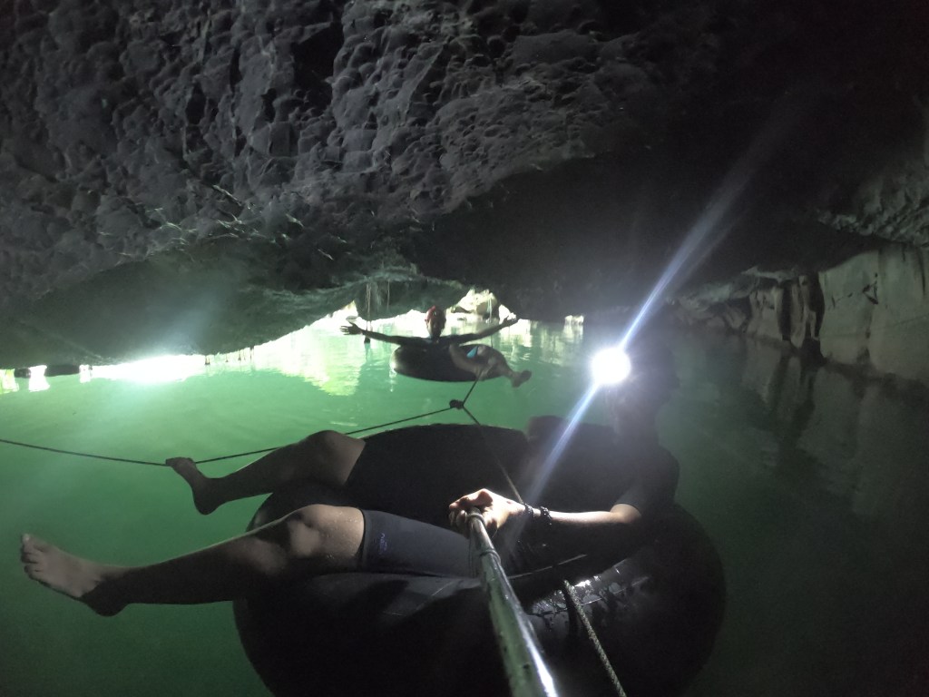 Mais nous, on aime bien les endroits où il y a personne, alors on tente l’expérience. On se change en maillot de bain – lycra, on s’arme d’un casque équipé d’une lampe frontale et on y va. Le mec nous indique avec ses trois mots d’anglais : « Tube / Cave / Corde ». En gros, c’est par là, prenez une bouée et démerdez-vous !
