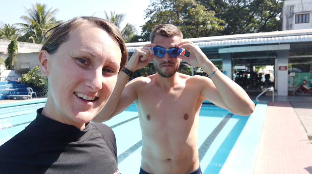 Ce matin, on se motive pour aller nager à la piscine municipale, située à seulement quelques centaines de mètres de l’hôtel. Quand on arrive c’est désert, il n’y a personne. On va être tranquille pour nager ! On paye l’entrée à 15 000 kips et ils nous prêtent des lunettes de piscine toutes pourries. Allez, on se jette à l’eau pour faire quelques longueurs. Déjà, le niveau de l’eau n’est pas assez élevé pour atteindre les rebords qui permettent la rotation de l’eau. Du coup, ça fait un bassin d’eau stagnante. Et en allant chercher les lunettes de piscine tombées au fond du bassin, ça remue le fond et fait remonter des centaines de petites boules blanches… Ça ne nous inspire pas vraiment confiance et on se demande si on a bien fait de sauter dans l’eau. On enchaine malgré tout une dizaine de longueur, puis on sort de l’eau au bout d’une demi-heure par peur d’attraper quelque chose. On va à la douche et on frotte fort avec le savon.