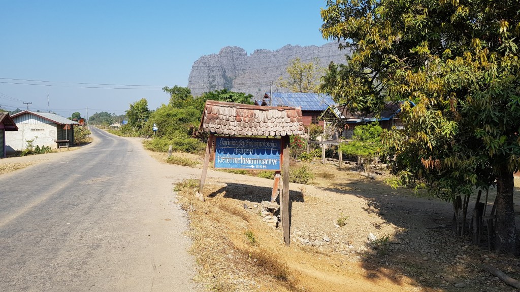 Après un pont, nous trouvons un panneau bleu indiquant « Welcome to Nan Non Cave – 1km ». Nous tournons alors sur une piste traversant un petit village. Les vaches nous ouvre la route.