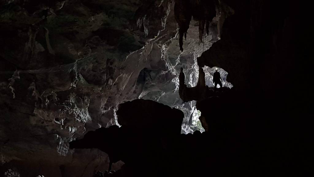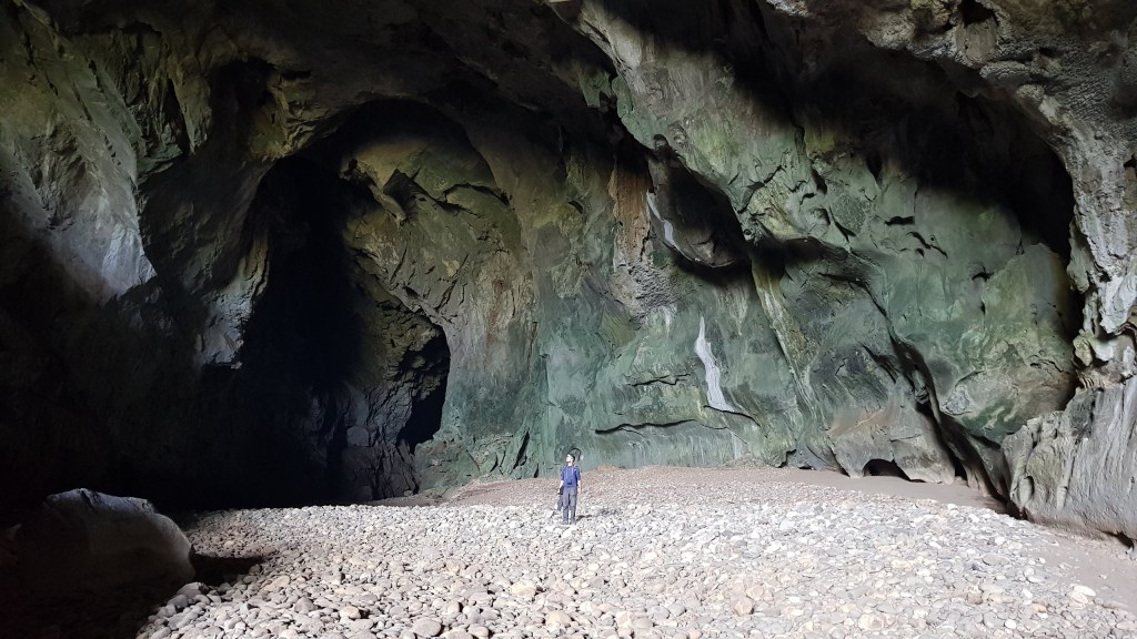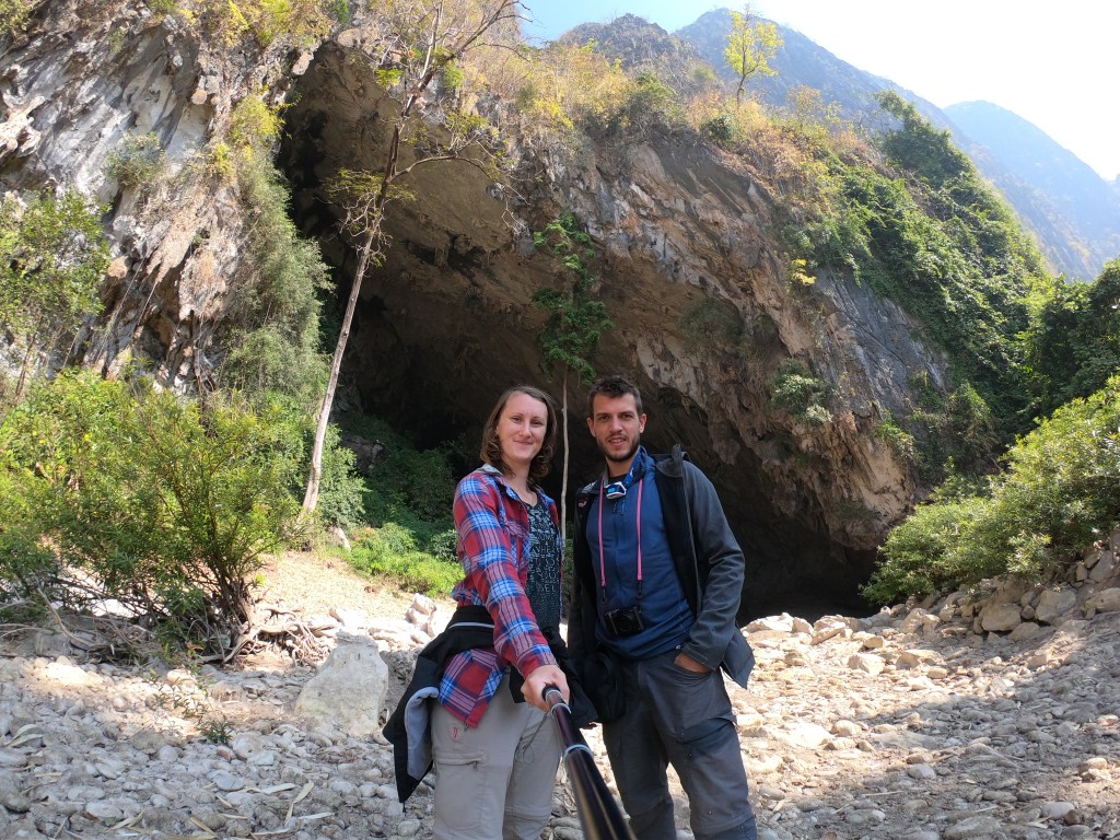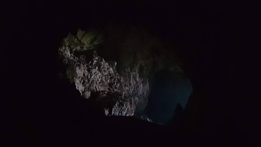 Et là, on y est ! L’entrée de la grotte forme un immense V couché. A l’entrée, quelques locaux sont présents. Nous croisons des femmes équipées d’une lampe frontale et d’un filet rond. Elles semblent y travailler pour chercher quelques choses mais nous ne savons pas quoi. Visiblement, cette grotte est très peu fréquentée par les touristes.