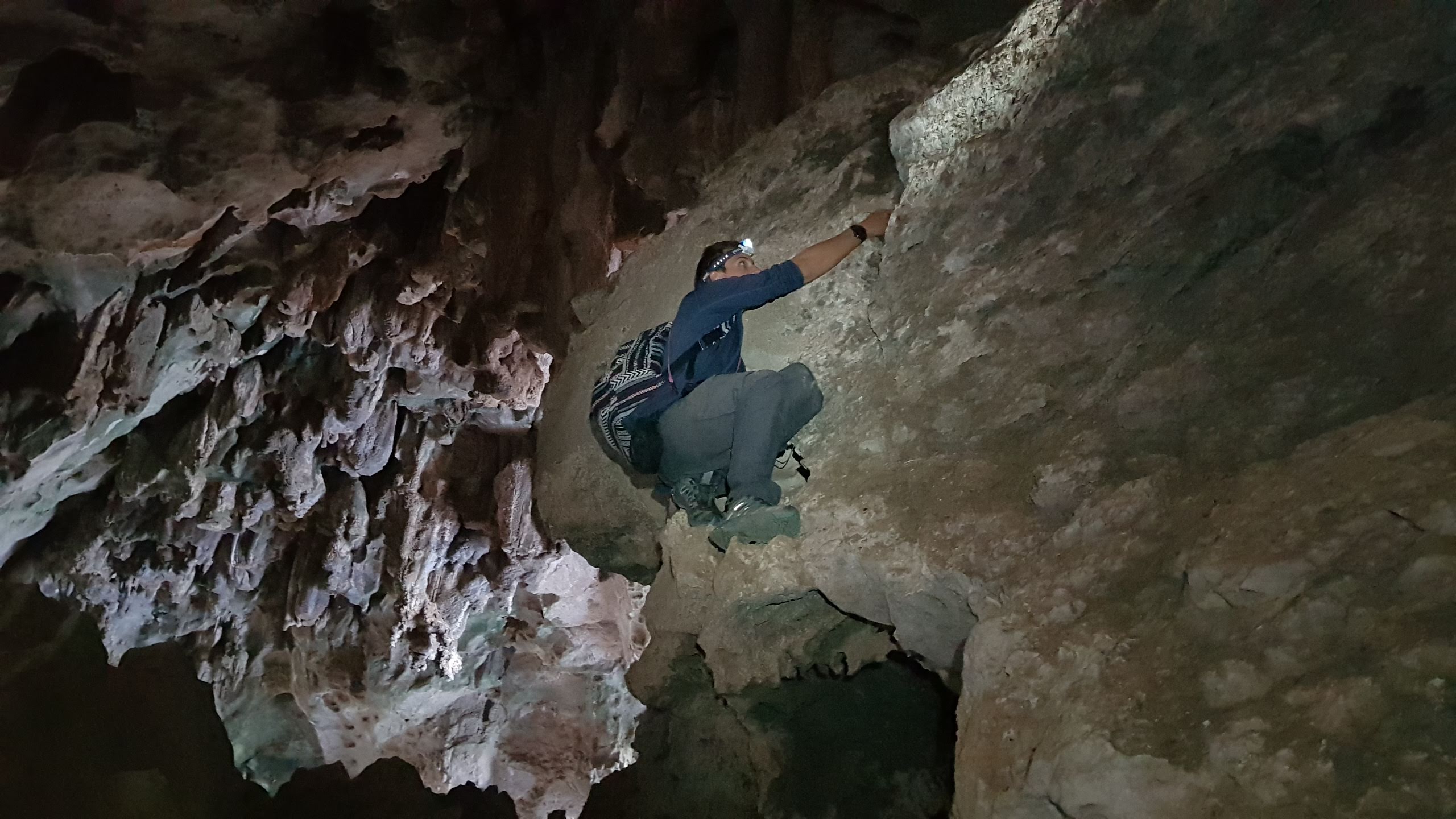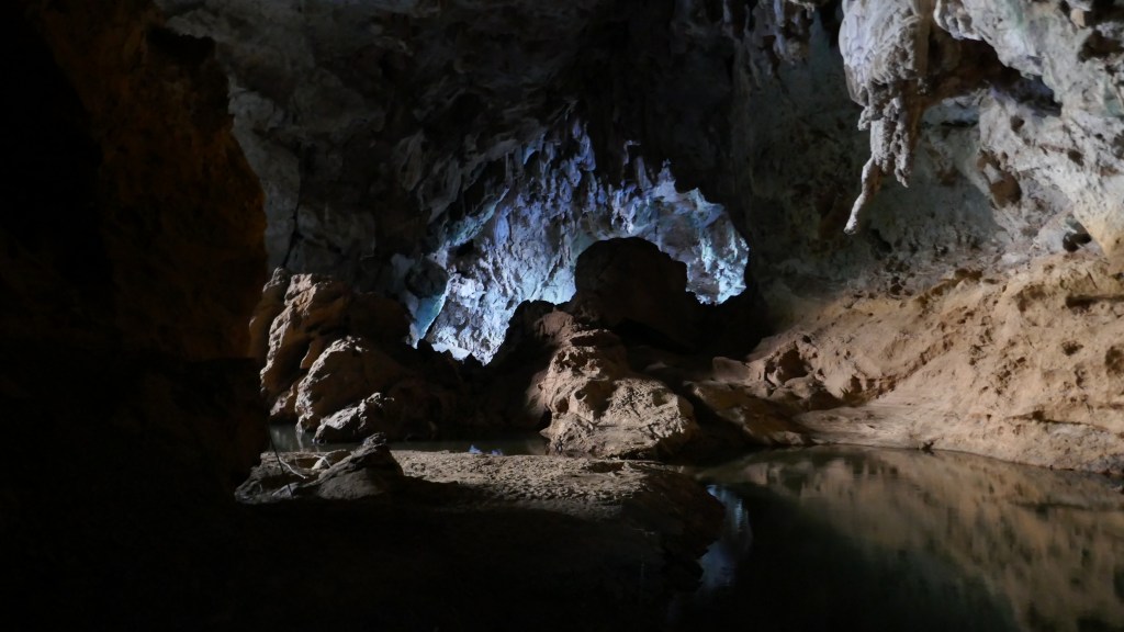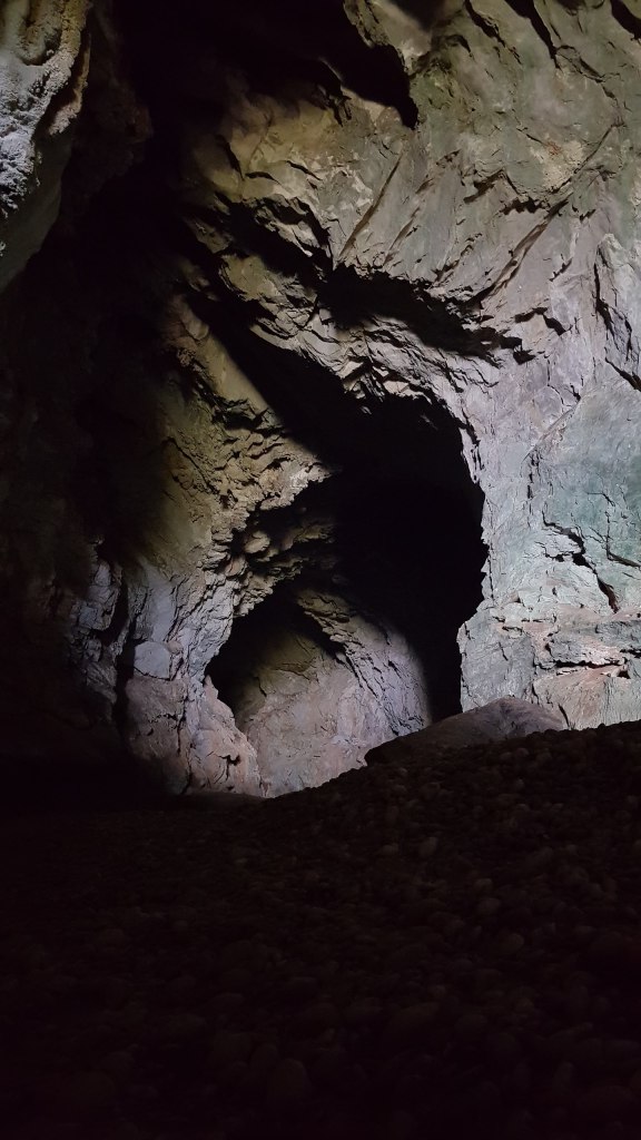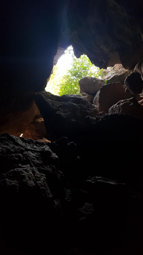 Nous progressons doucement et avec prudence dans la grotte. La marche est très facile. Après un virage, la pénombre s’installe laissant peu à peu la grotte dans le noir total. Cette fois, nous avons prévu le coup en partant avec deux lampes frontales, nos deux téléphones et une batterie externe en cas de panne. Le haut de la cavité est tellement grand qu’il nous est difficile de l’éclairer avec nos petites lampes. Par endroit, nous longeons d’énormes rochers tombés du plafond.