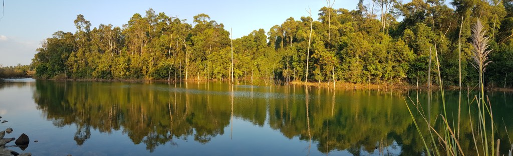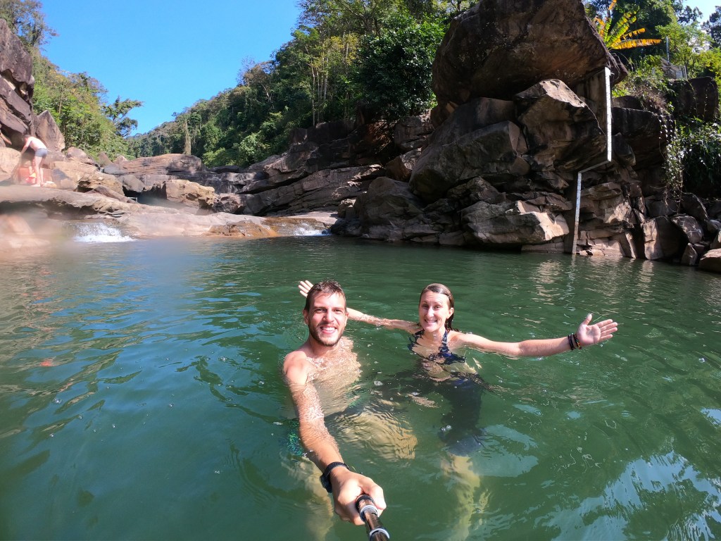 Une piste sur 3 km longe un grand lac au bleu étincelant. Nous garons le scooter pour rejoindre le bord de la rivière. Un chemin, des planches en bois, un pont, le traditionnel terrain de pétanque au côté des cabanes sur pilotis et du bar, la traversée de quelques rochers et nous arrivons au bord d’un magnifique bassin naturel.