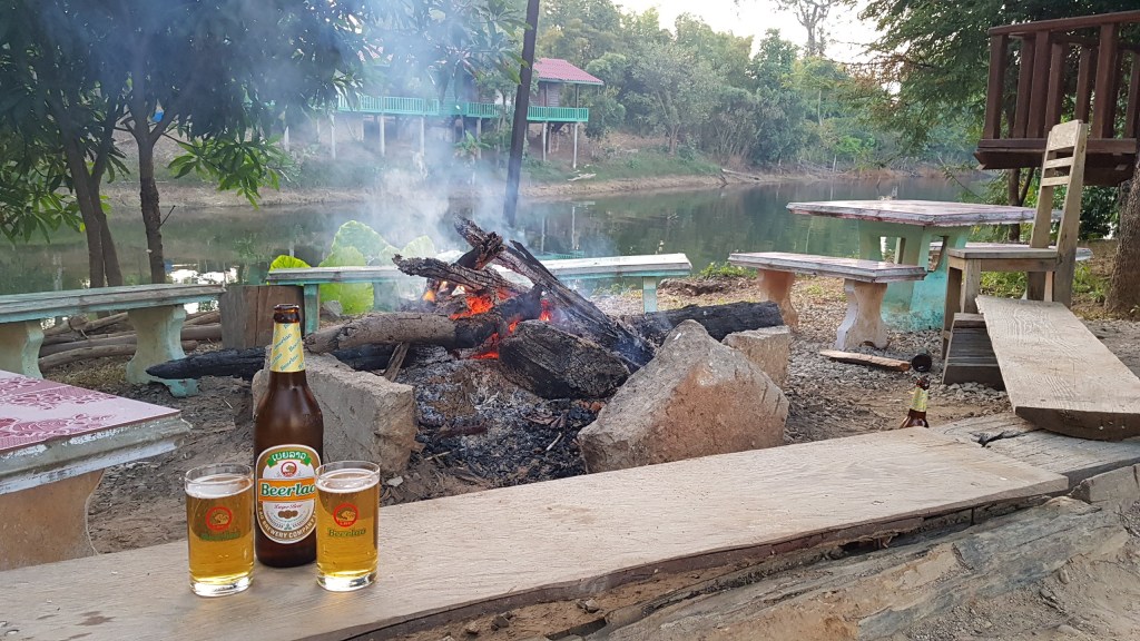 Nous arrivons au Phosy Thalang vers 16h30, encore quasiment les premiers arrivés. Nous optons cette fois-ci pour le bungalow numéro 12 à 8 euros de l’autre côté de la rive. Il fera largement l’affaire pour cette nuit. Nous rencontrons tout de suite nos voisins de chambrée qui seront nos compagnons pour la soirée.