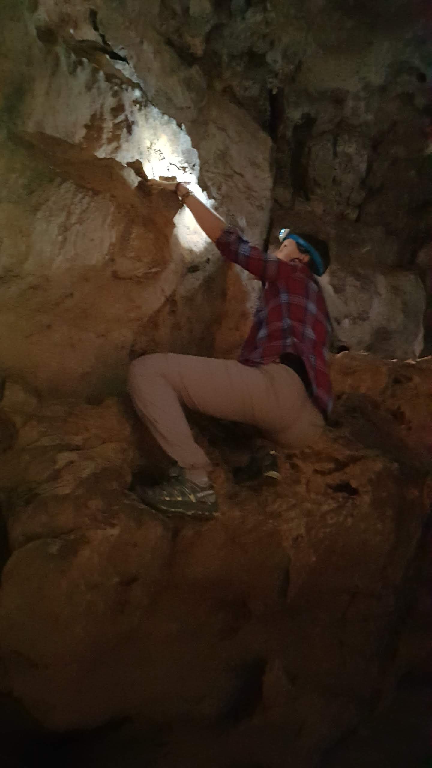 L’eau infiltre la grotte obligeant à sauter de roches en roches et à escalader les bords pour ne pas mettre les pieds dans l’eau. Un passage étroit comme un couloir mène de l’autre côté de la grotte. La lumière entre de tous les côtés, l’eau ruisselle d’un bout à l’autre, des tas de roches tombées du ciel s’accumulent, formant ainsi un parfait terrain de jeu pour nous et nos âmes d’enfant grimpeur. La grotte est juste époustouflante.
