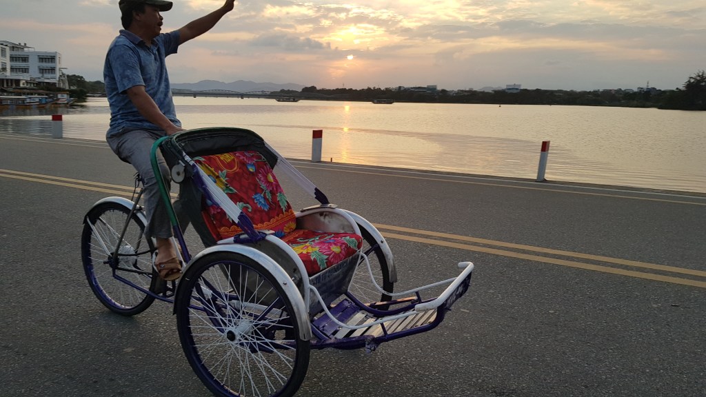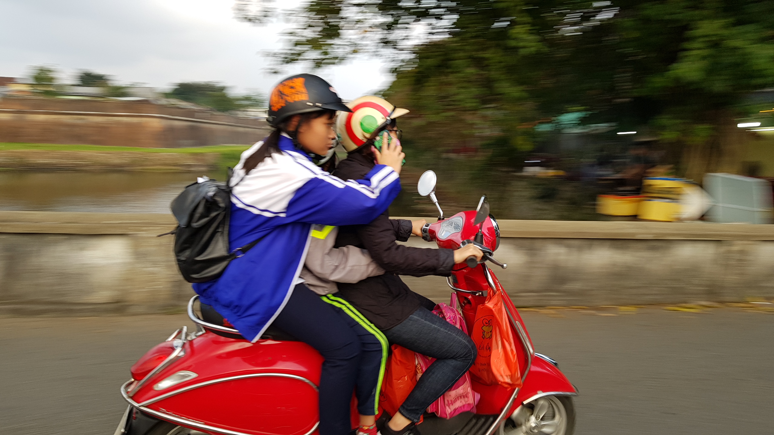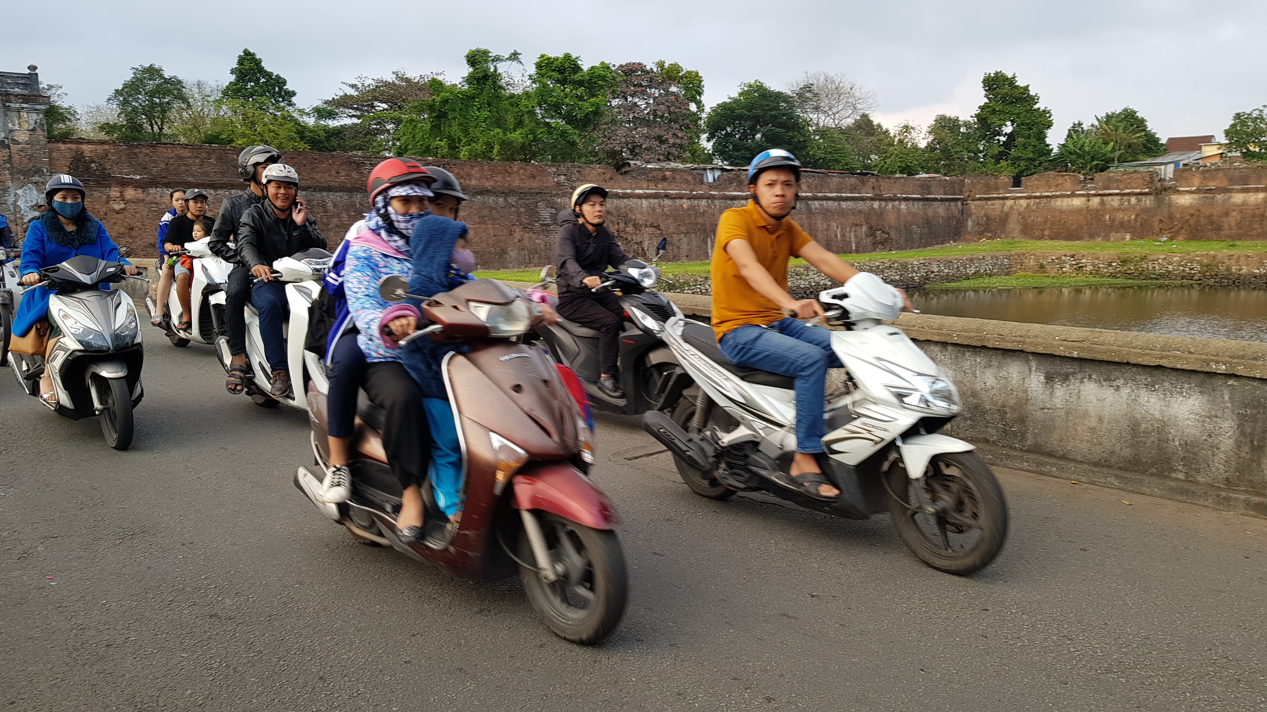 Le bus nous dépose proche du centre ville de Hué vers 17h. Nous parcourons le kilomètre qui nous sépare de l’hôtel à pied. Comme d’habitude au Vietnam, les scooters ont envahi la ville et viennent de toutes parts. On ressent tout de suite une ville très animée et urbaine.
