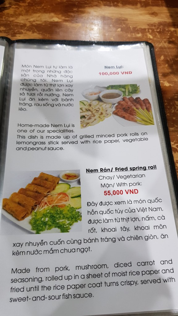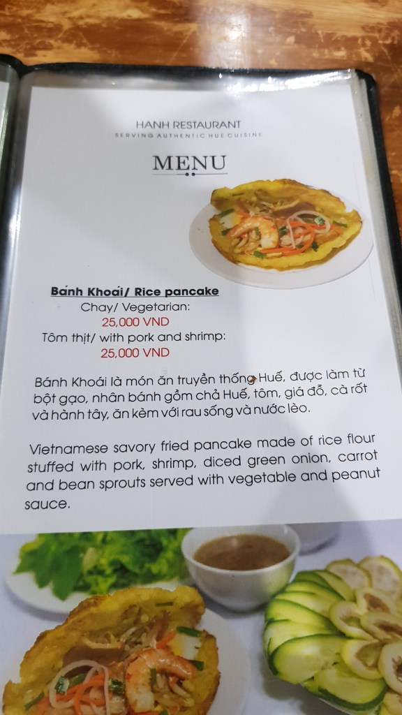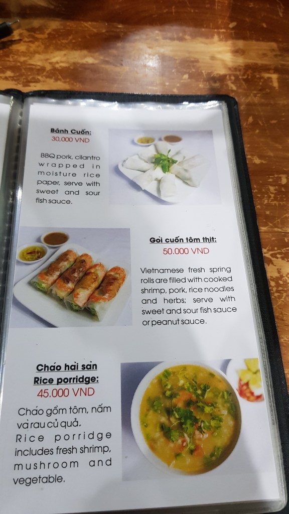 On s’installe dans notre chambre, puis on ressort faire un petit tour de la ville. Premier arrêt au Hanh Restaurant qui nous a été conseillé par l’hôtel pour « manger local » .