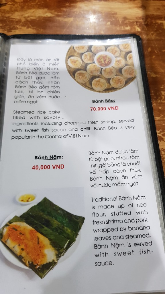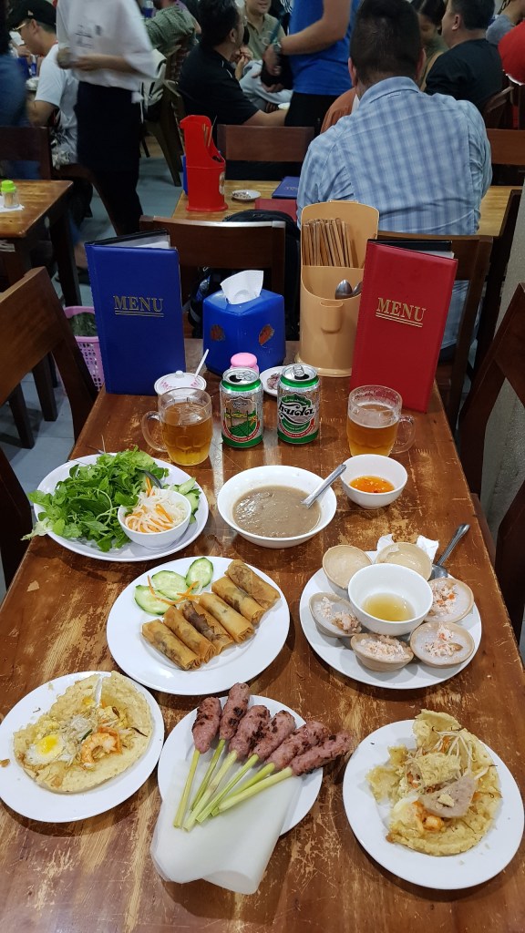 Déjà, le restaurant est bien rempli et animé, et fait très local. Nous commandons la bière locale, une Hudda Beer. Puis, un assortiment de 5 spécialités locales : Banh Bèo, une sorte de petite coupelle remplie de blanc d’œuf saupoudré de crevettes et oignons frits – Banh Khoai, rice pancake avec viandes, crevettes et porc – Nem Lui, (Hanh’s speciality) une boule de viande de porc autour d’un bâtonnet de citronnelle avec feuille de riz et sauce cacahuète – Banh Cuon thit nuang (BBQ pork wrap in moisture rice paper), sorte de rouleau de printemps – Nem Ran, traditionnel fried spring roll.