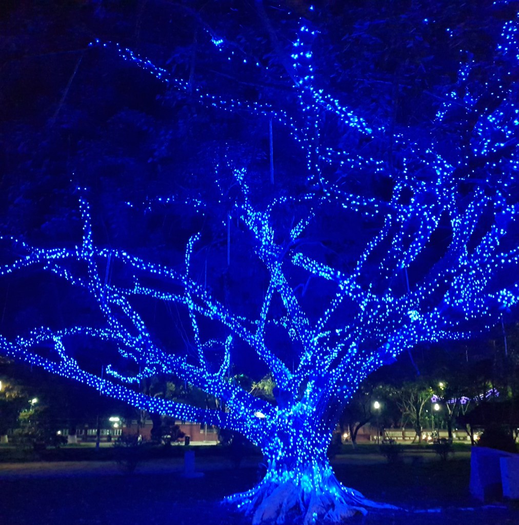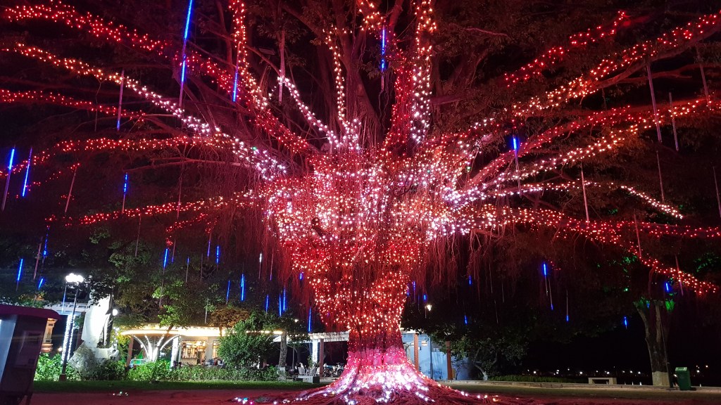 Nous continuons par une petite balade aux alentours. Un passage par les rues touristiques remplies de bars, restaurants, et magasins. La ville est bien animée. Nous profitons ensuite d’une petite balade le long du fleuve. Des bateaux dragon proposent des tours sur le fleuve. Un restaurant flottant en forme de lotus illuminé borde les quais. Un pont dont les couleurs varient et se reflètent sur le fleuve offre un spectacle assez magique. De nombreux groupes de jeunes se retrouvent sur les quais : échange de Pétéca, musique, chant, guitare, répétition de chorégraphie, rancart… C’est assez amusant de traverser cette promenade en observant la vie des jeunes locaux. Au bout de la ballade, de grands arbres sont tout illuminés de guirlandes lumineuses. On a l’impression d’approcher un arbre magique !
