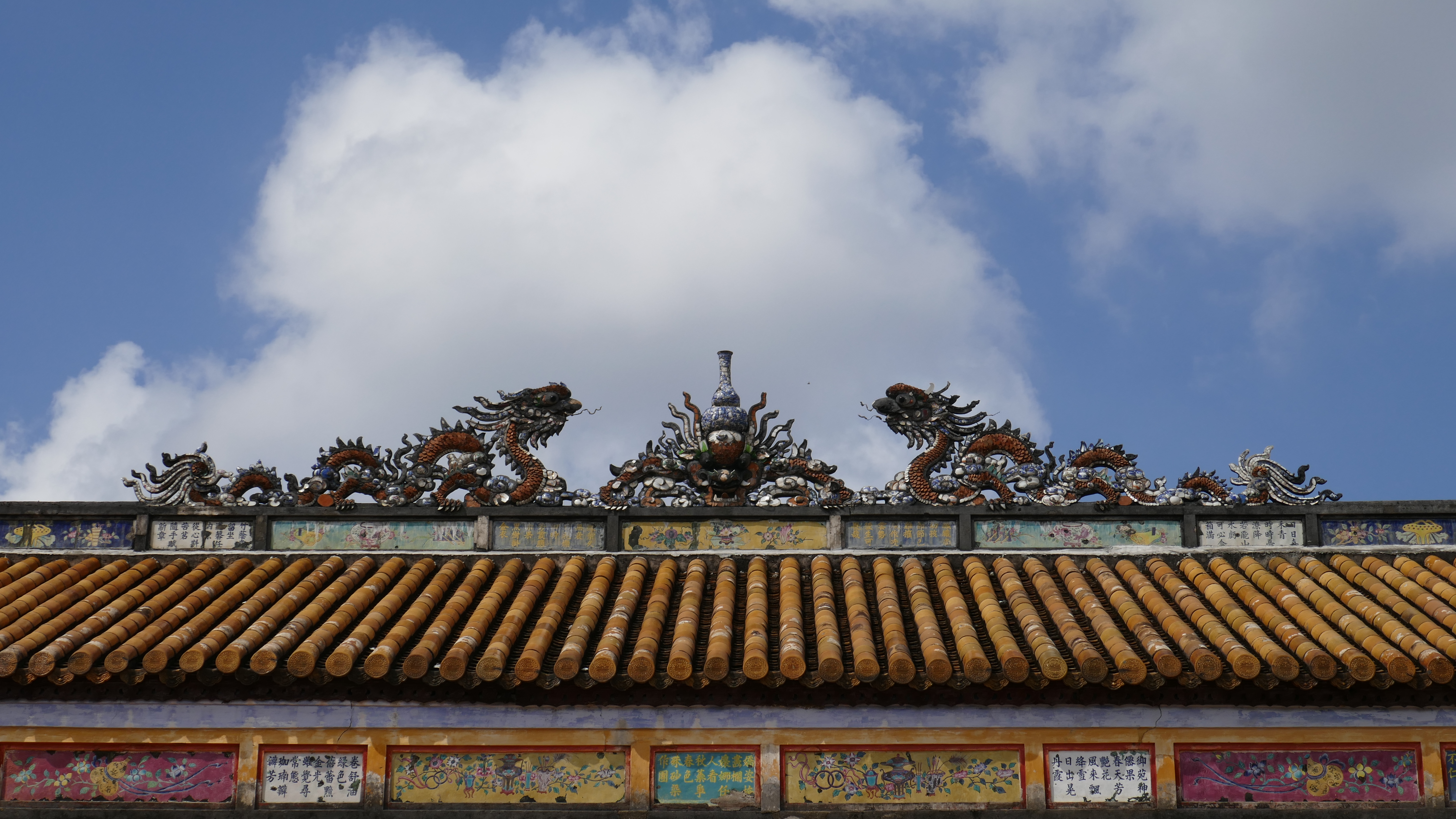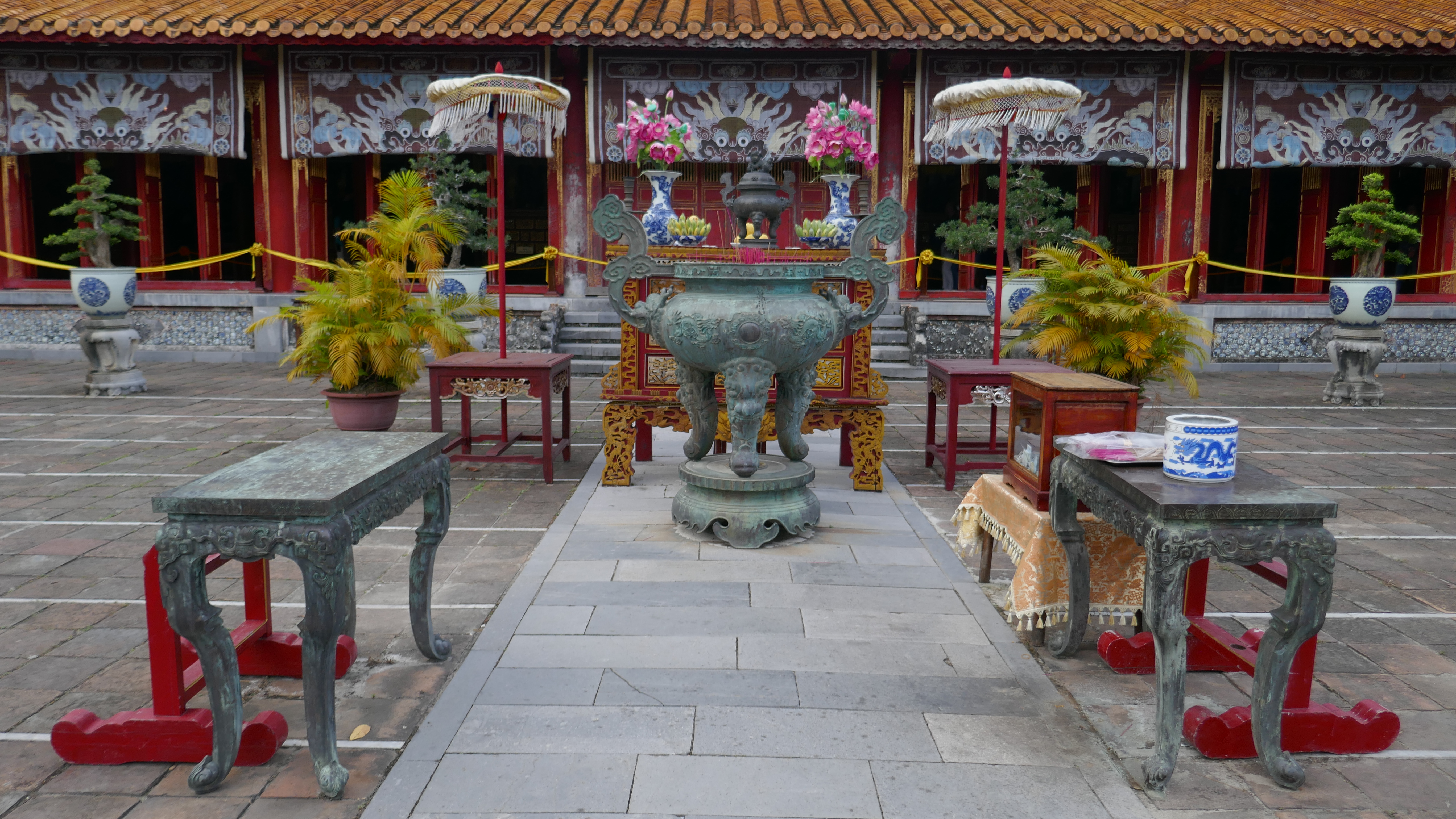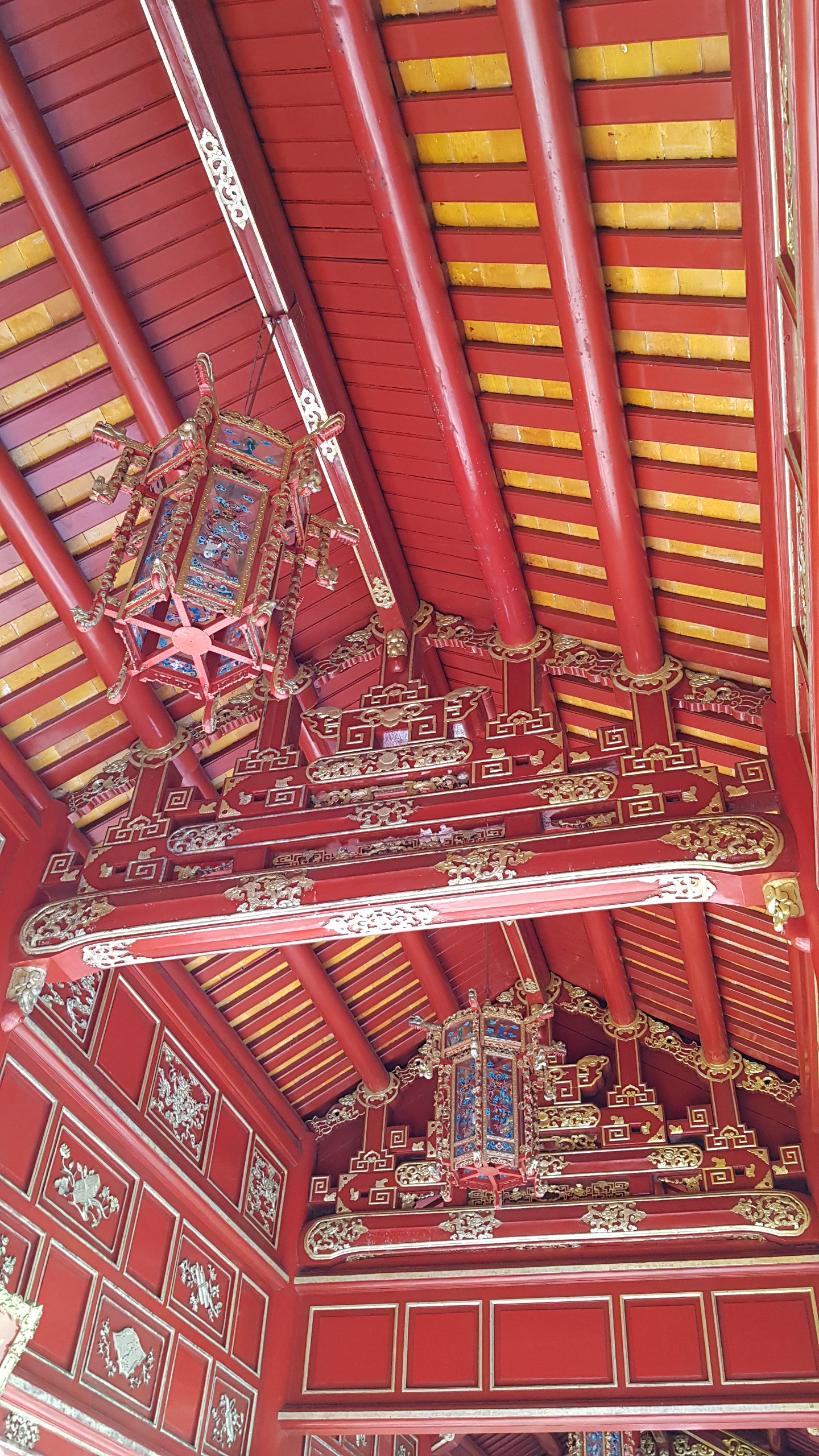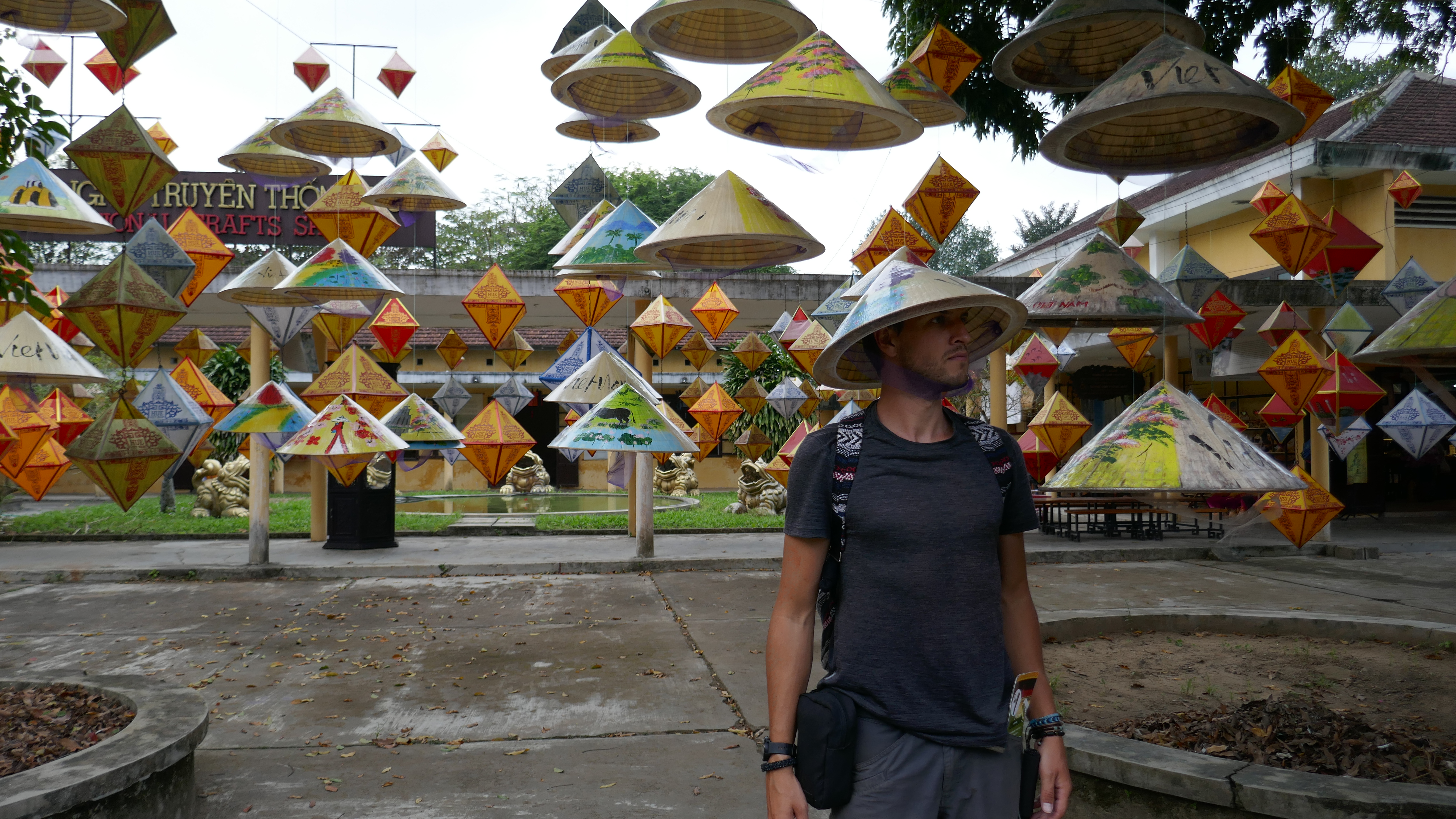 Nous continuons notre chemin en suivant une petite route le long du fleuve. Celle-ci nous mène en fait à une petite ruelle de la largeur d’un couloir où vivent les locaux. Dans les rues apparentes de Hué, on y trouve seulement des hôtels, bars et restaurants. Nous avons ici l’impression de découvrir la face cachée de Hué. Malgré le regard bienveillant des locaux, nous sommes un peu gêné de passer là, comme l’impression de ne pas être à notre place. Nous nous faisons donc très discret et découvrons le mode de vie des locaux : une minuscule ruelle, des maisons étroites et toutes petites où s’accumulent plusieurs membres d’une même famille. Toutes ont une télé écran plat disproportionnée par rapport à la taille de la maison. Nous croisons des jeunes jouant aux cartes, des enfants qui jouent au ballon, et plus insolite, une cérémonie funéraire en plein milieu de la rue…