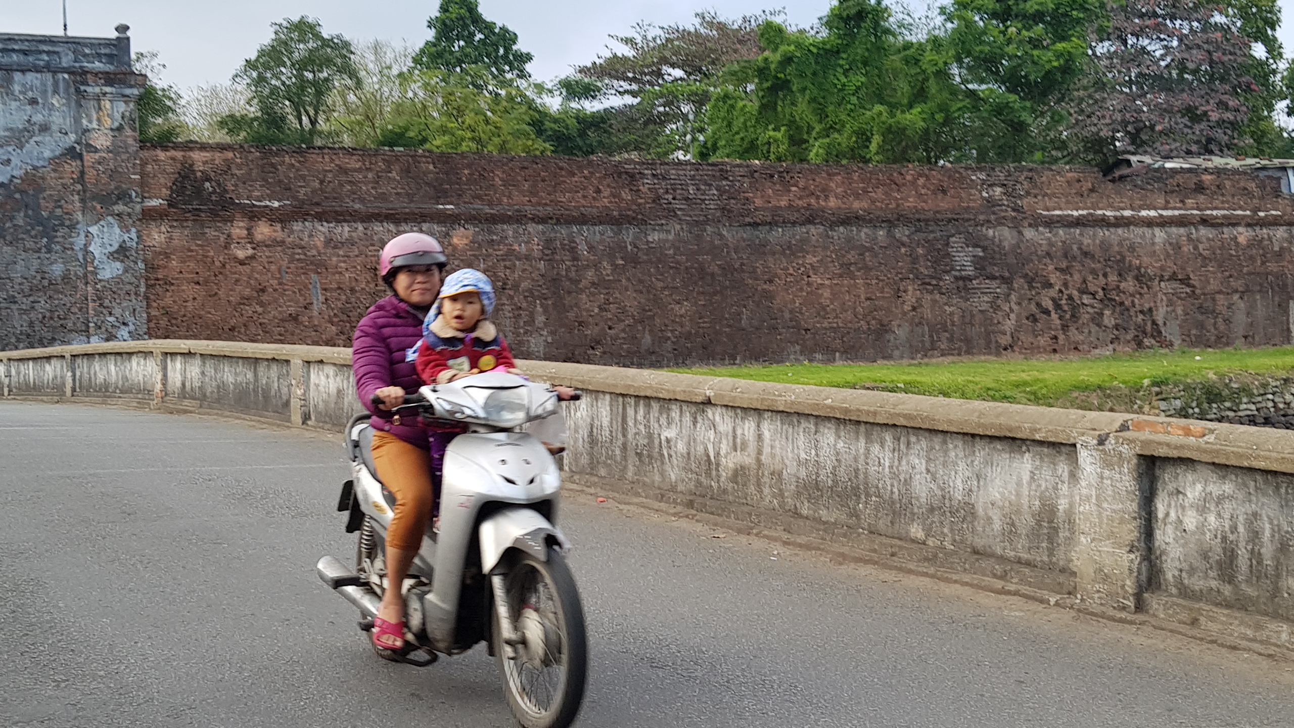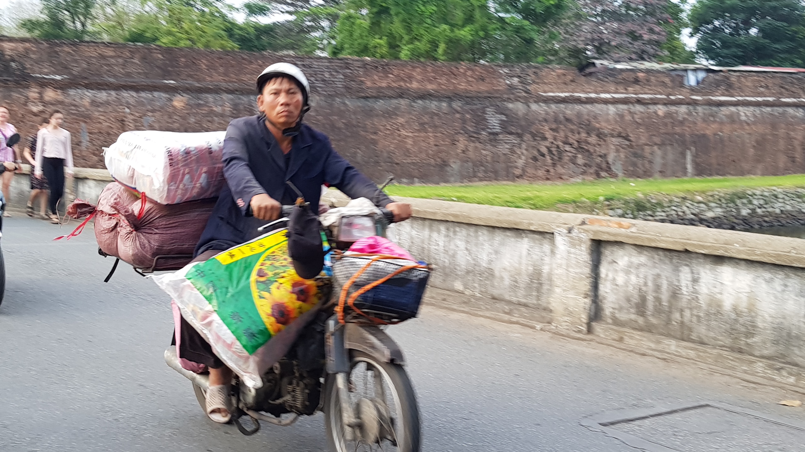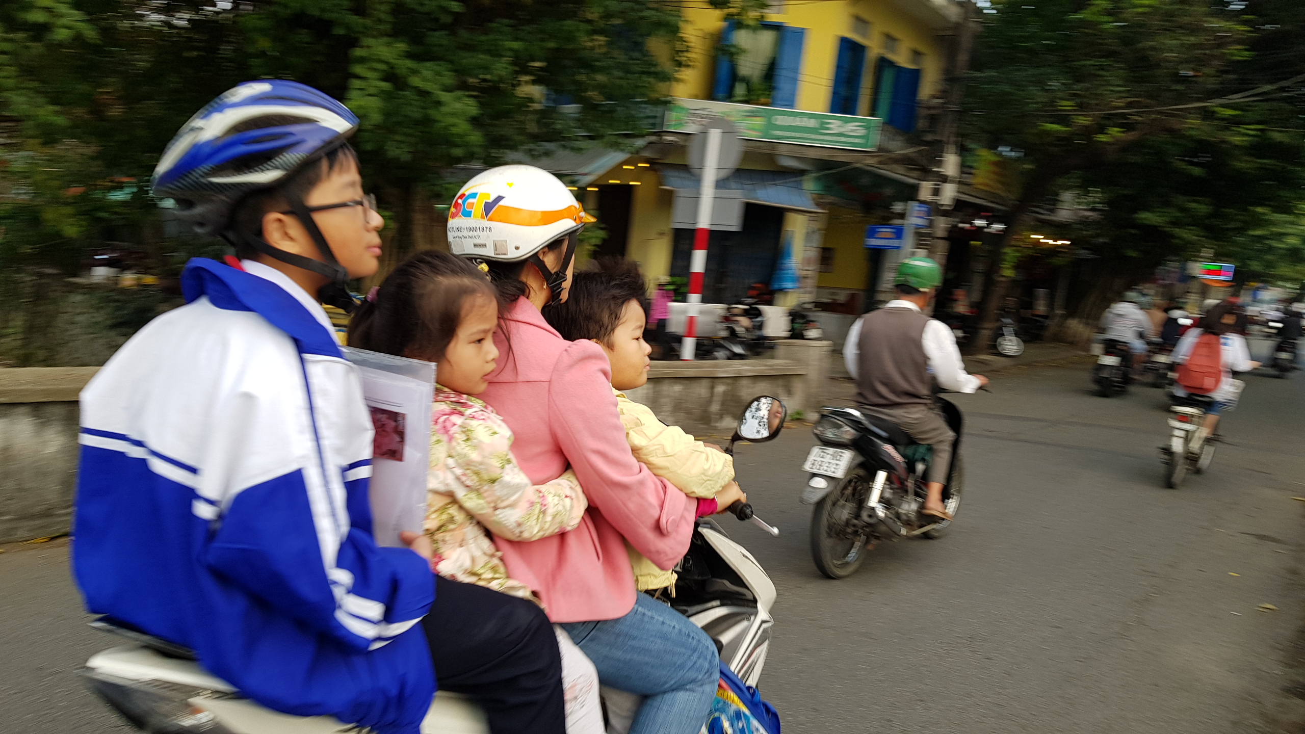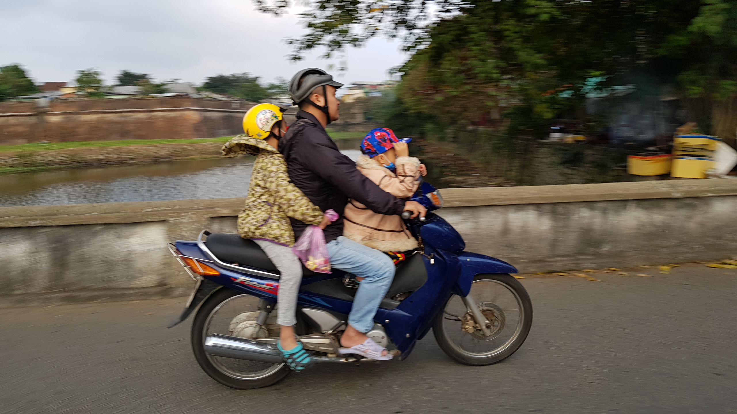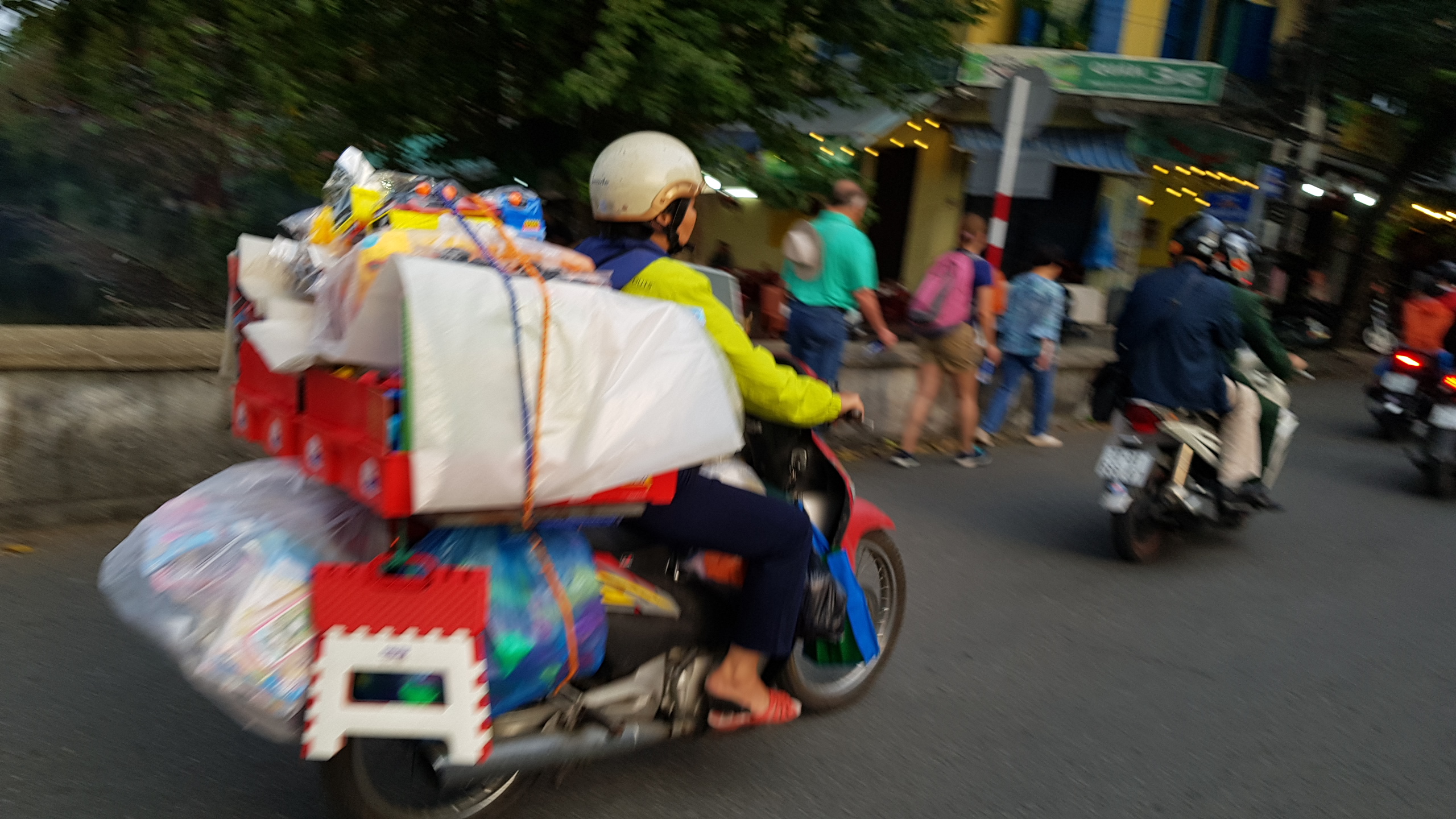 Nous restons quelques temps à observer les scooters défilant sur le pont : souvent des bébés à l’avant ou calés entre les deux parents, parfois des familles de 3, 4 jusqu’à 5 membres sur le même scooter, des marchandises débordant de toutes parts, des « teams » de pousse-pousse à chasubles trimbalant des chinois blazés…