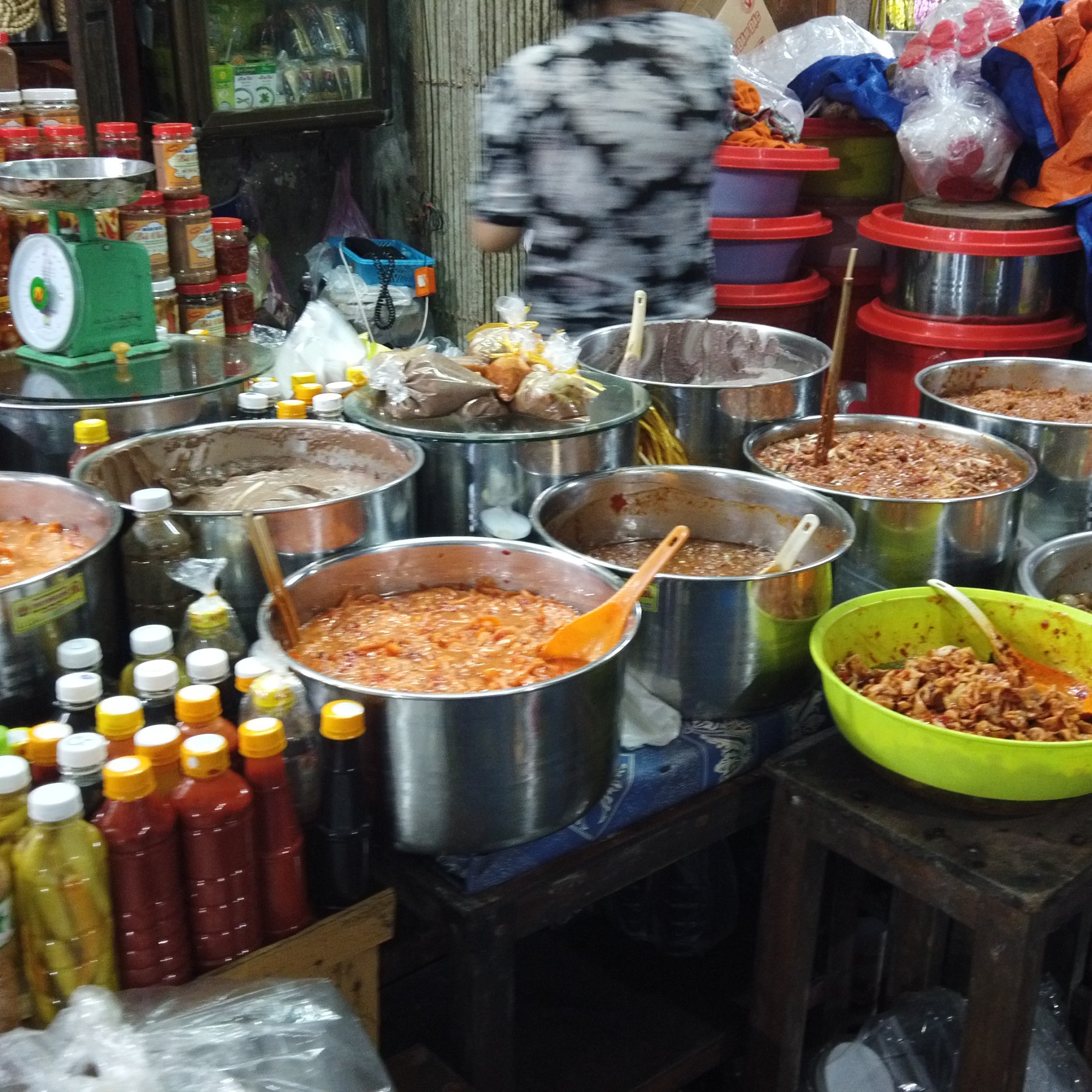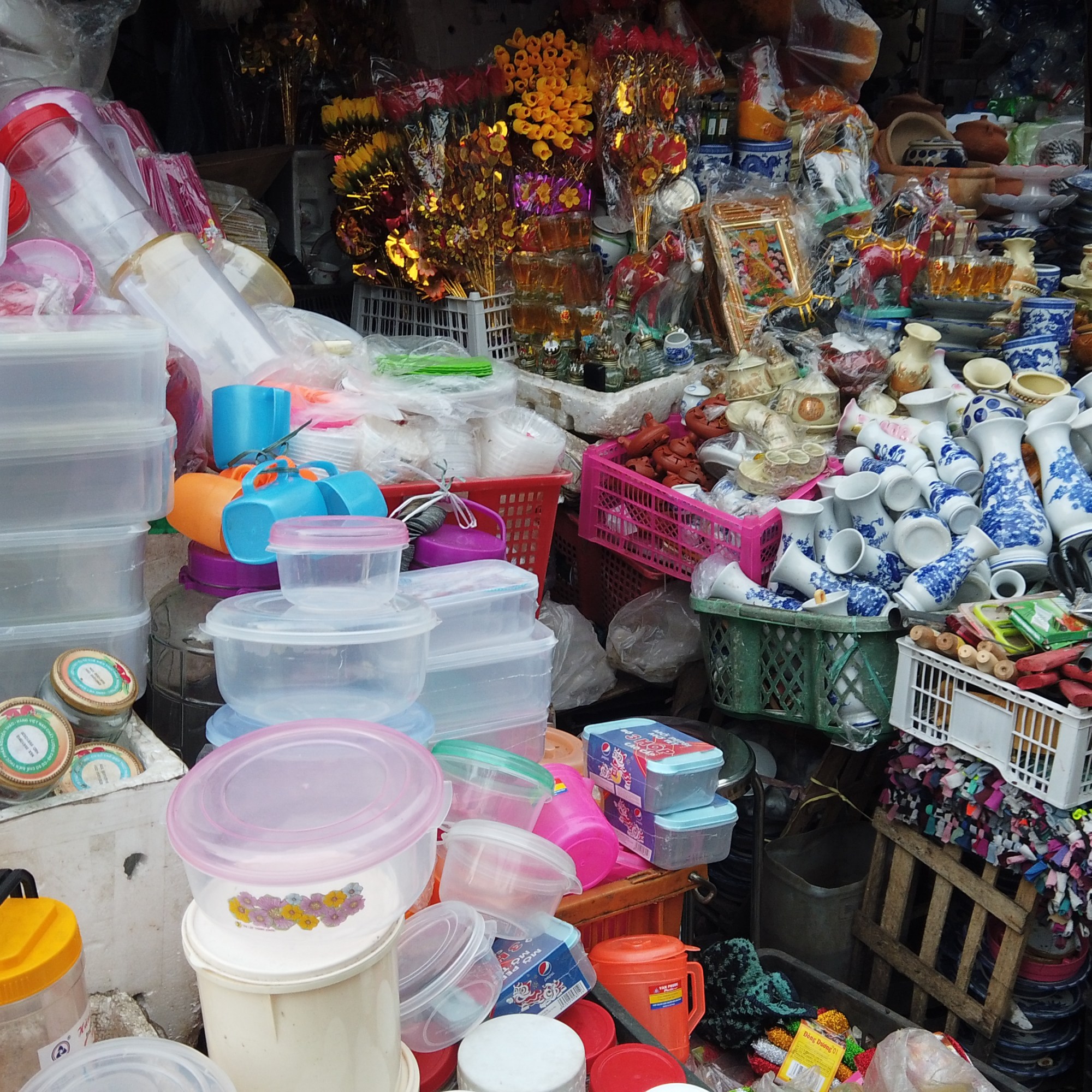 A l’intérieur, c’est pire ! Des étales de boîtes en plastique, des crevettes, des sauces, des bonbons, des fleurs, des statues, des produits d’hygiène, j’en passe et des meilleurs. Des restaurants dont la nourriture traine à même le sol. Des cuisines dont l’odeur laisse présager de la qualité gustative des produits. Des rats et des souris se promènent tranquillement à travers les stands de nourritures. C’est assez impressionnant de voir le grand n’importe quoi de ce gigantesque marché.