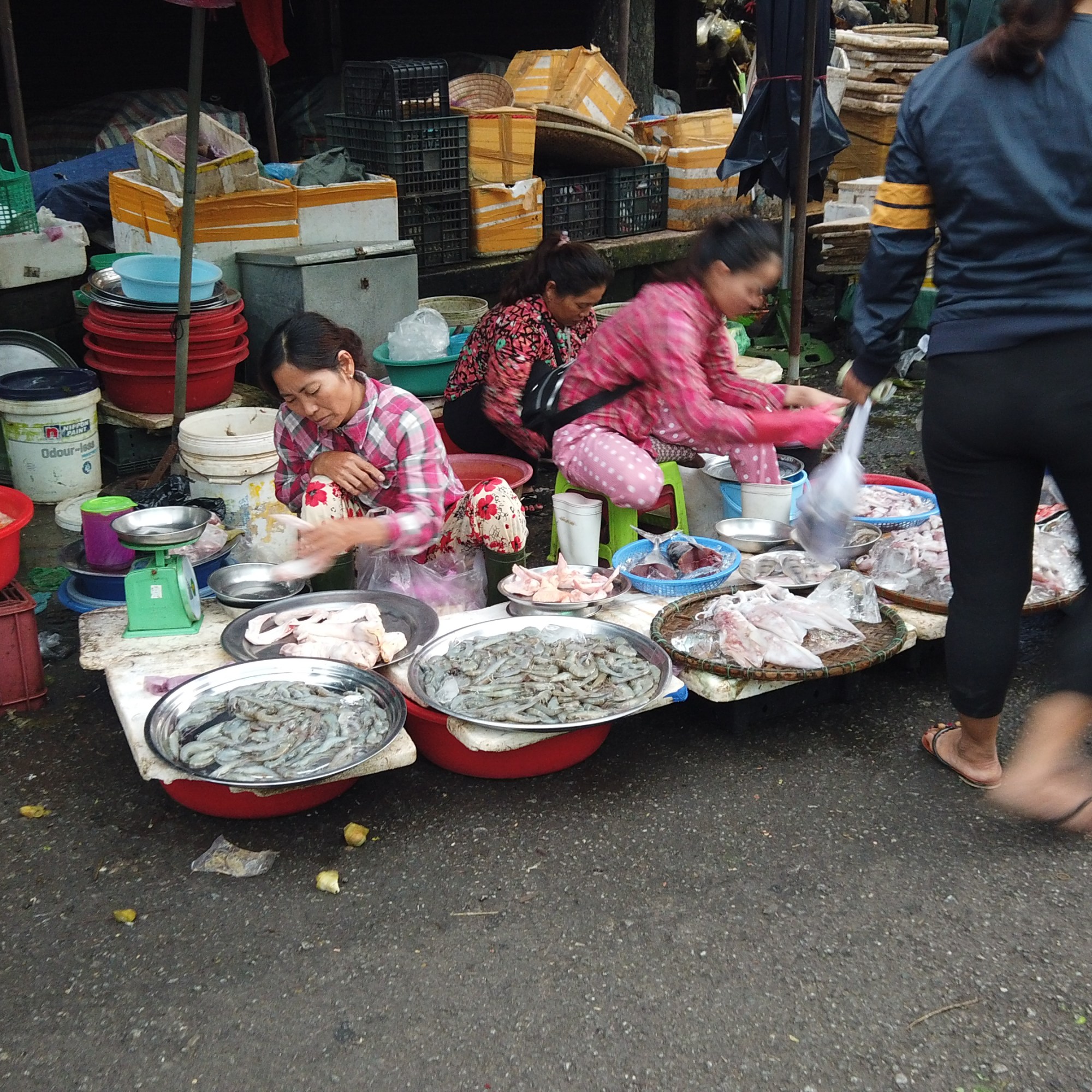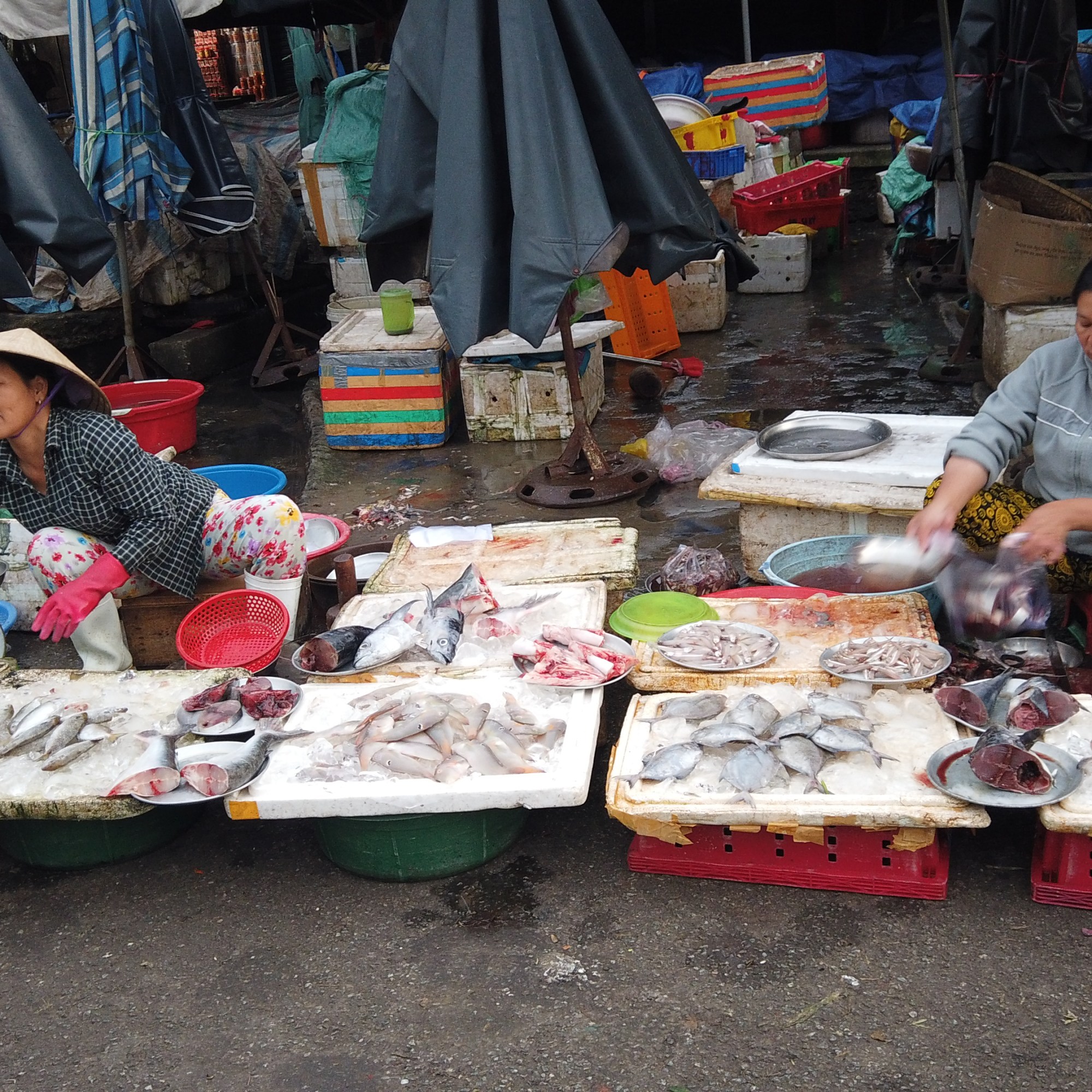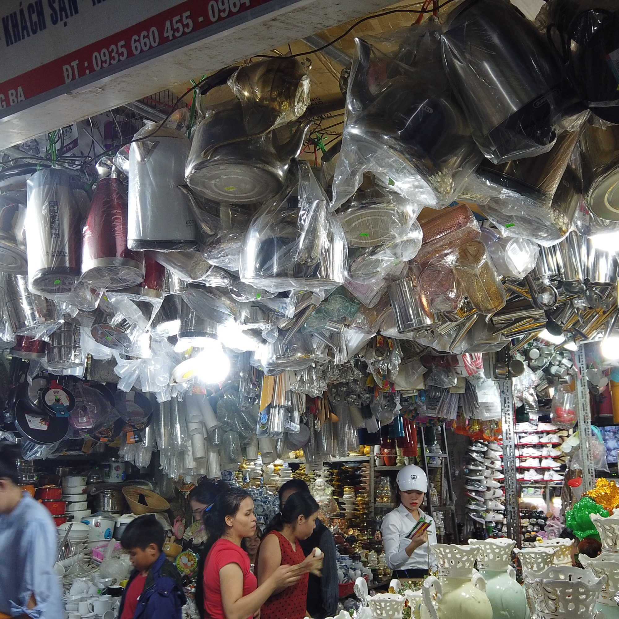 Le marché est immense et c’est un joyeux bordel. Comme un peu partout au Vietnam c’est complètement anarchique. A l’extérieur, on trouve des étales regroupant des étalages de tout et n’importe quoi empilés les uns sur les autres, des vendeuses de légumes, de poissons, de viandes, à même le sol. On ne sait pas depuis combien de temps c’est là mais sachant qu’il est 17h et que le marché est ouvert toute la journée, les produits ne doivent pas être très frais. Nous ne nous tenterons pas à goûter quoi que ce soit provenant de ce marché. Et aucun européen ne saurait être à même de pouvoir y goûter. Les piétons, scooters, vélos tentent de se frayer un chemin à travers les stands.
