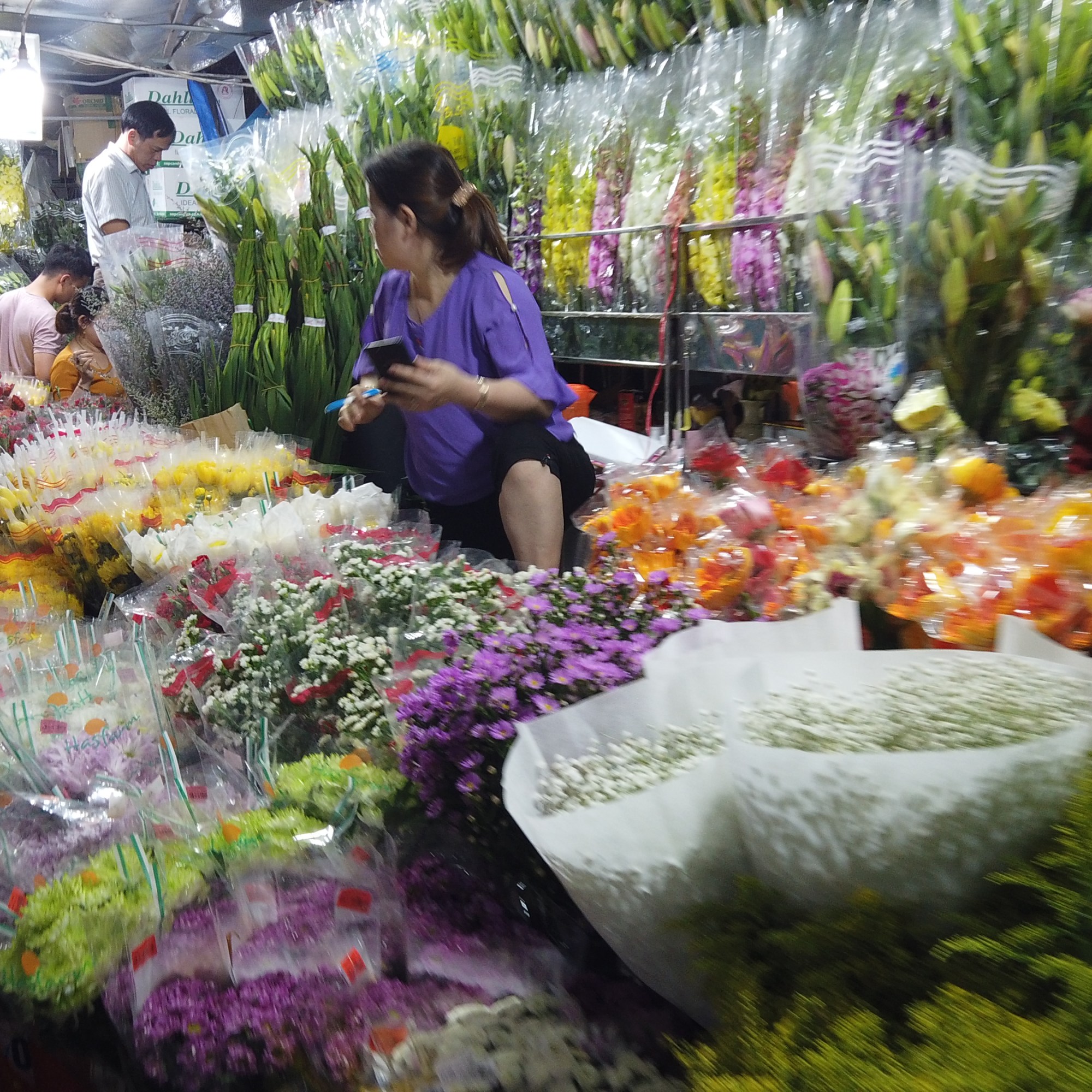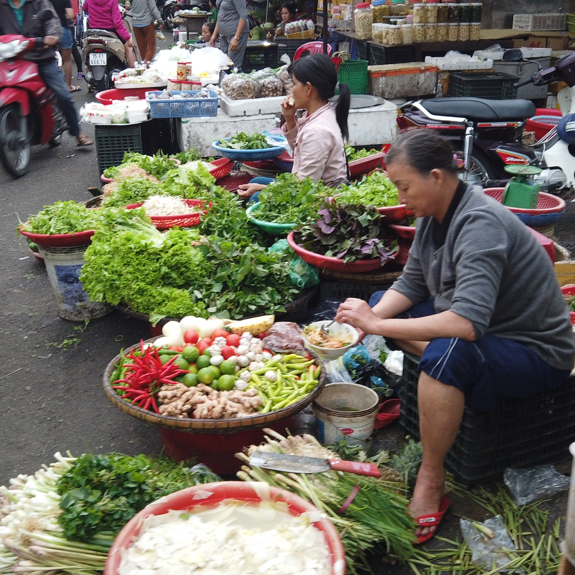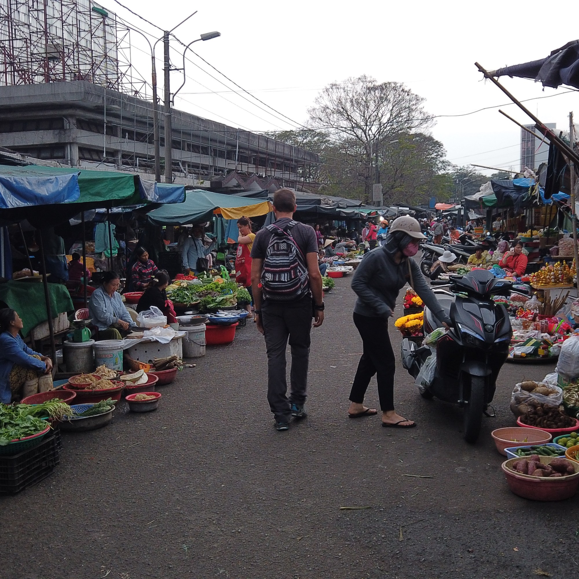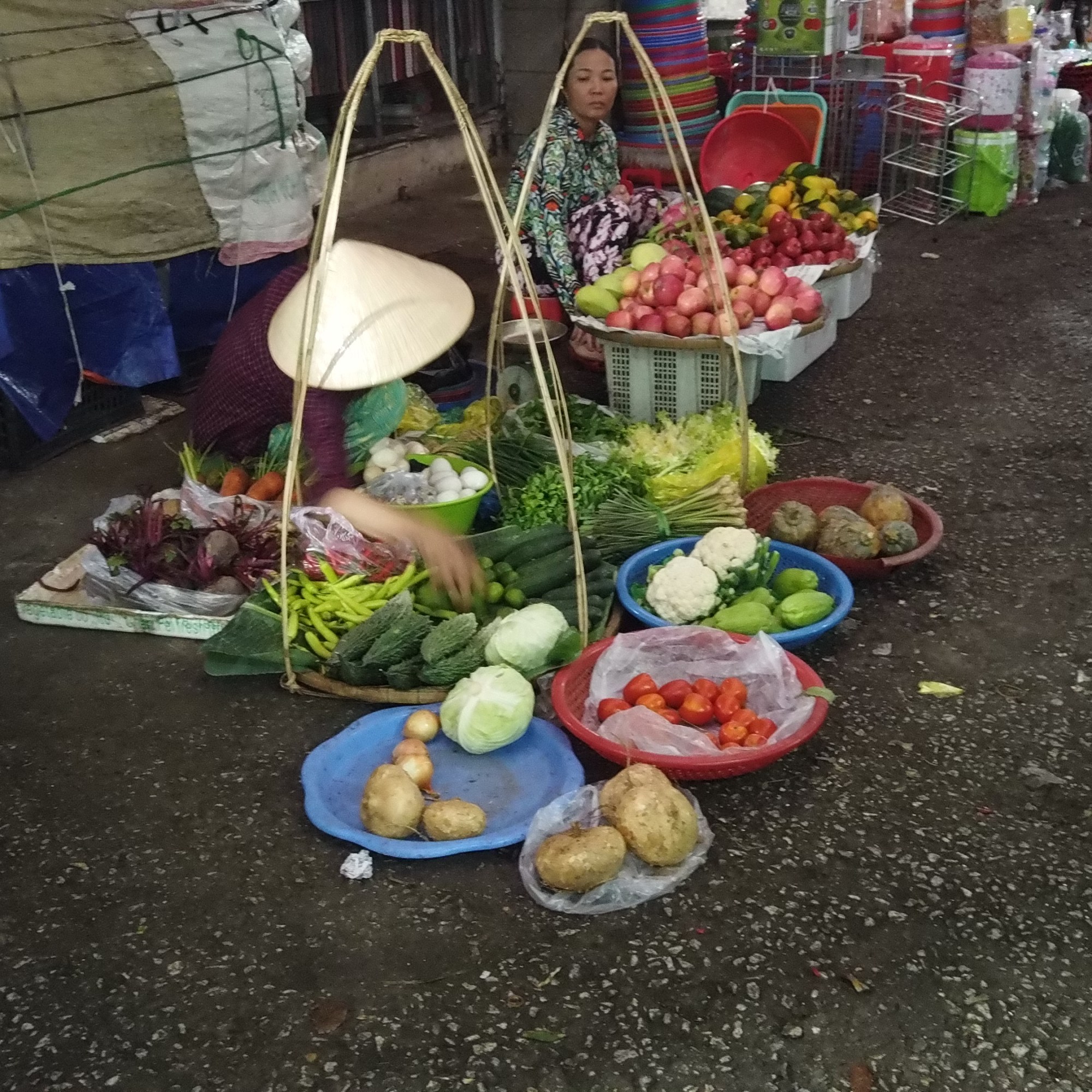 Le marché est immense et c’est un joyeux bordel. Comme un peu partout au Vietnam c’est complètement anarchique. A l’extérieur, on trouve des étales regroupant des étalages de tout et n’importe quoi empilés les uns sur les autres, des vendeuses de légumes, de poissons, de viandes, à même le sol. On ne sait pas depuis combien de temps c’est là mais sachant qu’il est 17h et que le marché est ouvert toute la journée, les produits ne doivent pas être très frais. Nous ne nous tenterons pas à goûter quoi que ce soit provenant de ce marché. Et aucun européen ne saurait être à même de pouvoir y goûter. Les piétons, scooters, vélos tentent de se frayer un chemin à travers les stands.