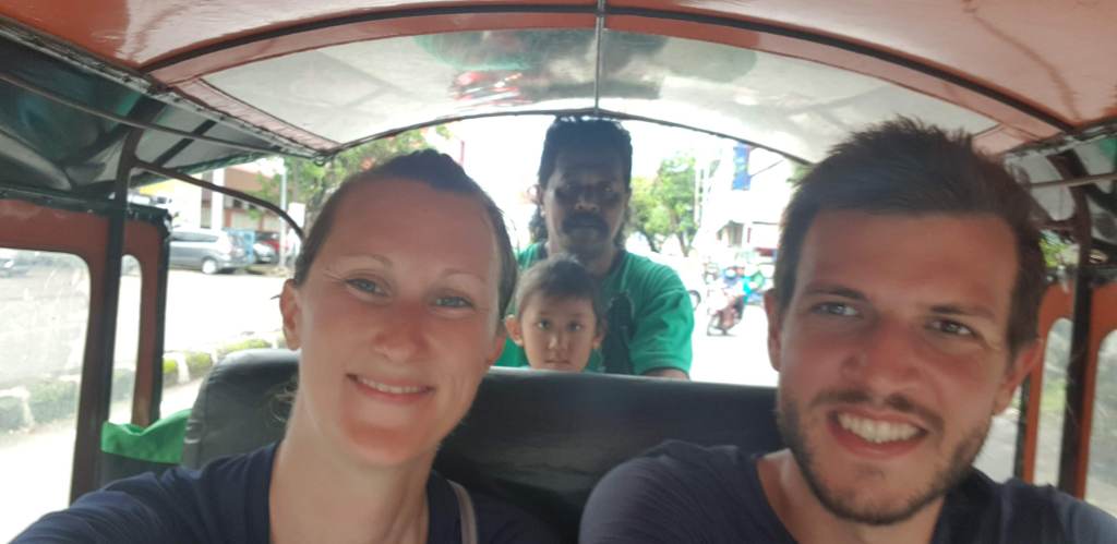 Bon pour l’instant, les rues d’Indonésie ressemblent fortement à celles d’Asie : des bouchons, des scooters, des klaxons, des locaux qui proposent des tuk tuk… Sauf qu’ici les tuktuk sont quelques peu différents : des banquettes bi-place sont installées à l’avant du scooter. Pas top niveau visibilité pour le chauffeur.