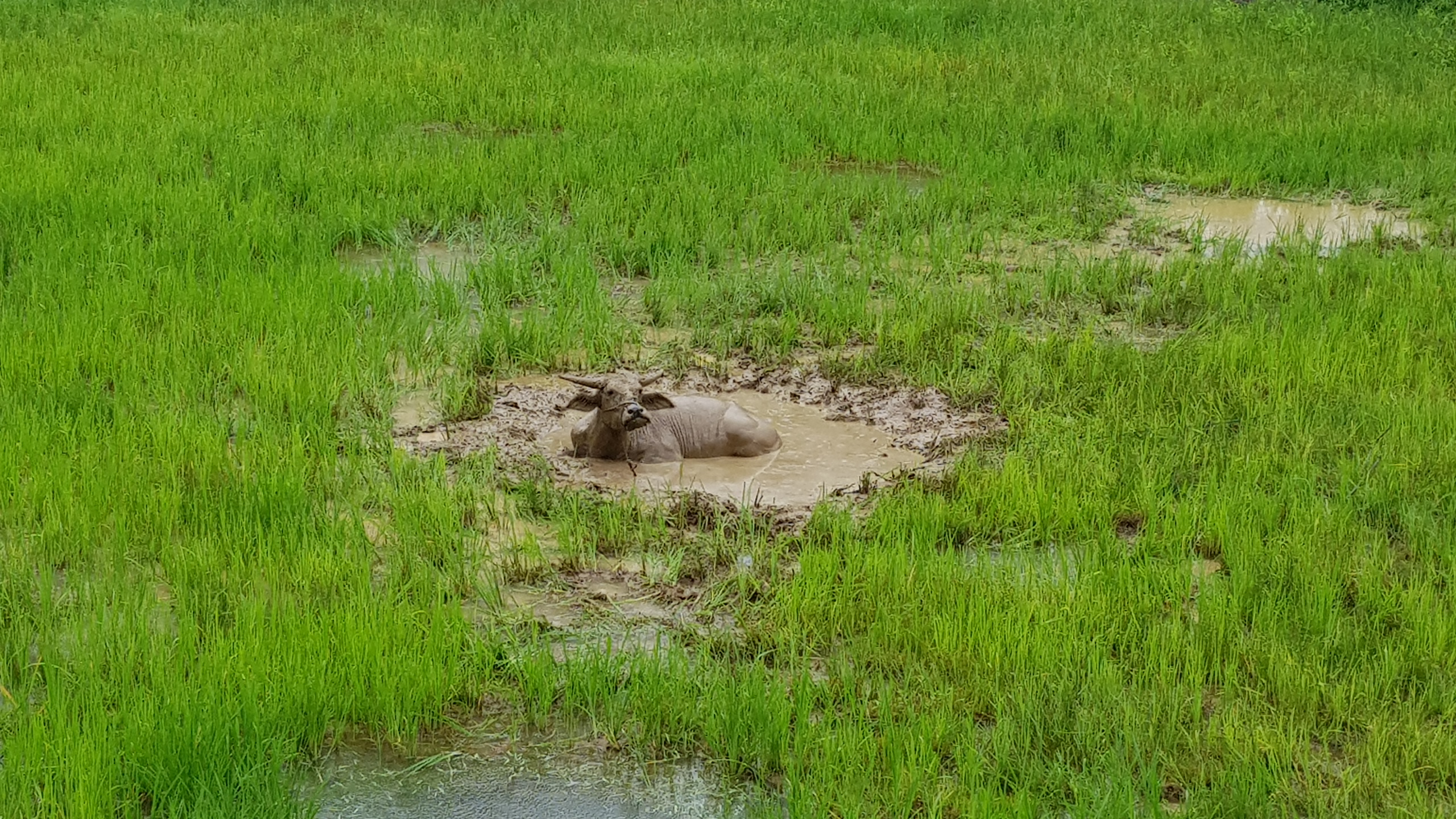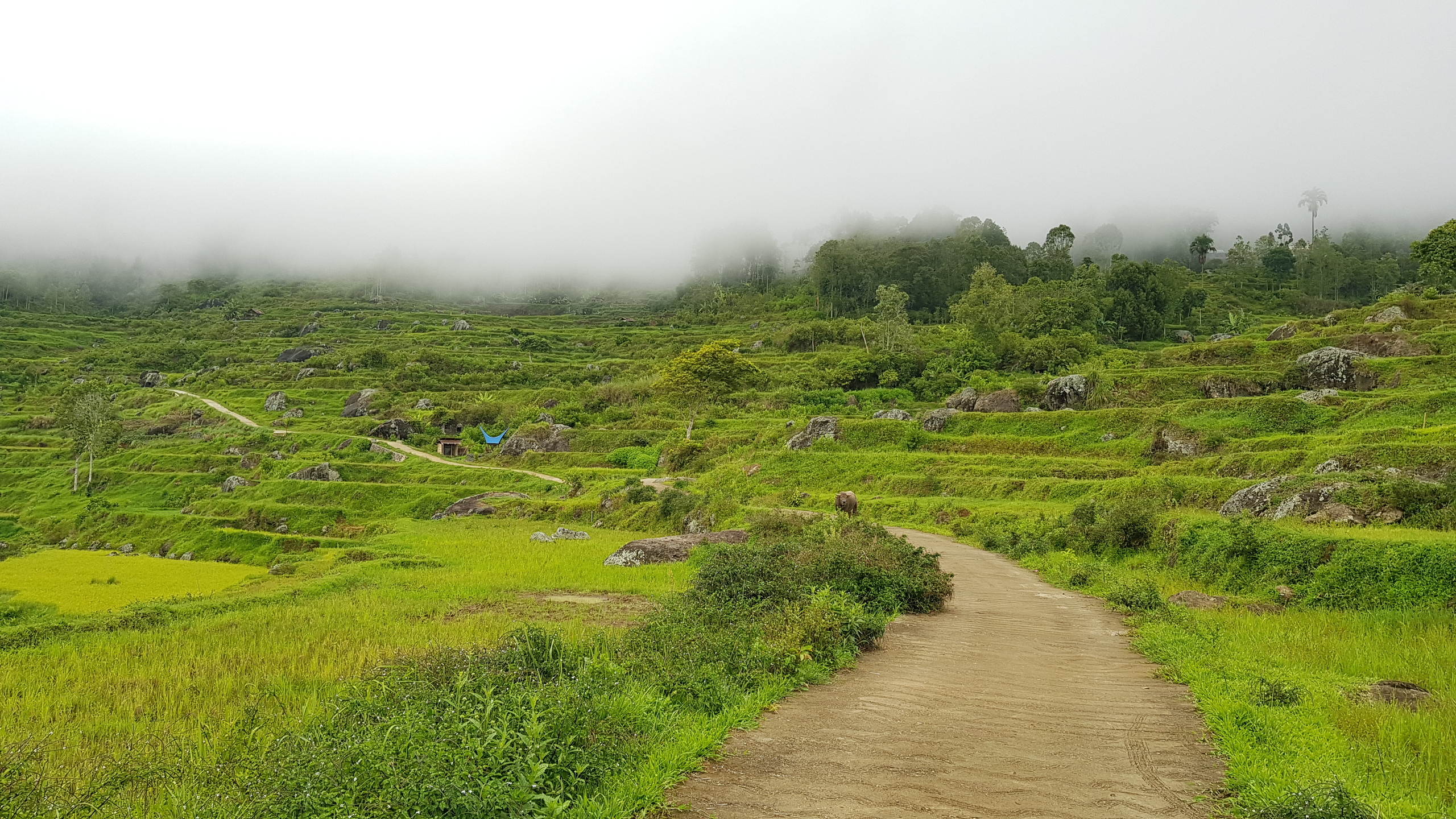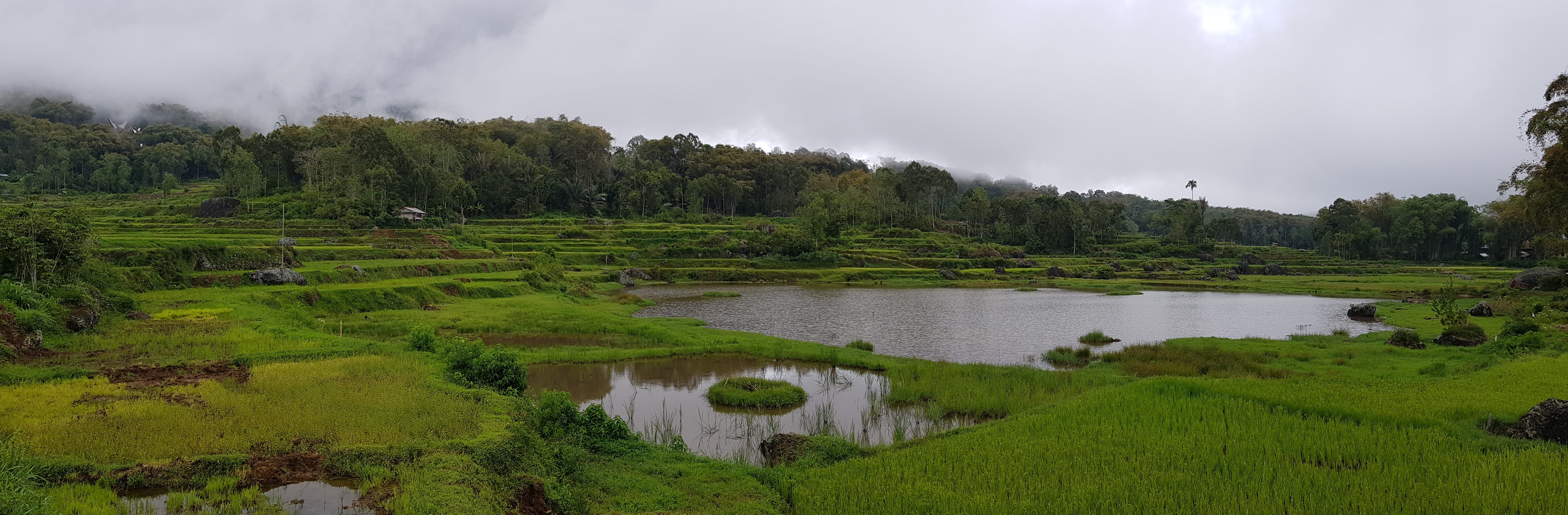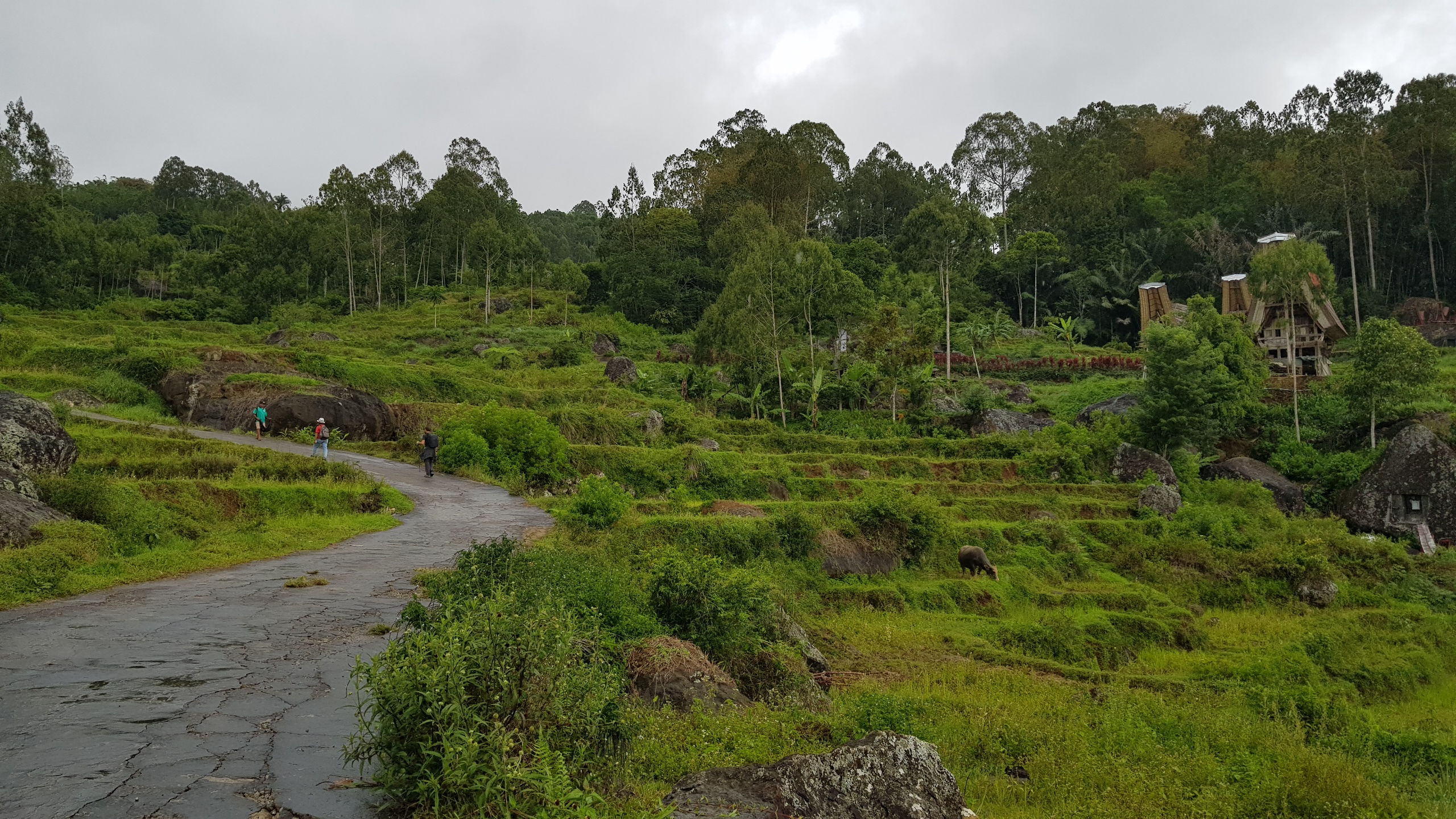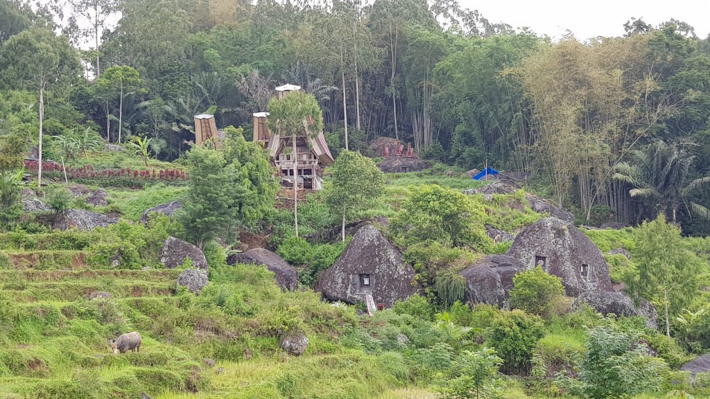 Nous repartons alors pour les quelques kilomètres restants. De magnifiques paysages s’offrent à nous. Des rizières en terrasse bordées de montagnes, des roches rondes sortant de terre qui coupent avec le vert des rizières, les nuages filant à toute allure qui donnent une ambiance particulière aux lieux, des buffles cachés dans les flaques de boue… De quoi émerveiller nos yeux d’explorateurs ! En prime, une vue plongeante et imprenable sur la ville de Rantepao.