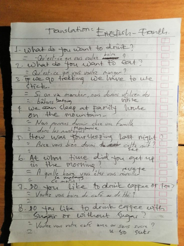 Après le repas, une petite séance de traduction avec Jacob. Nous lui écrivons des traductions en français de quelques phrases qu’il nous a demandé. Et quand il s’agit de lire le français tel que le mot « soeur » on se rend compte que c’est pas simple. Il réécrit les phrases avec sa propre phonétique qui semble effectivement tellement plus simple !