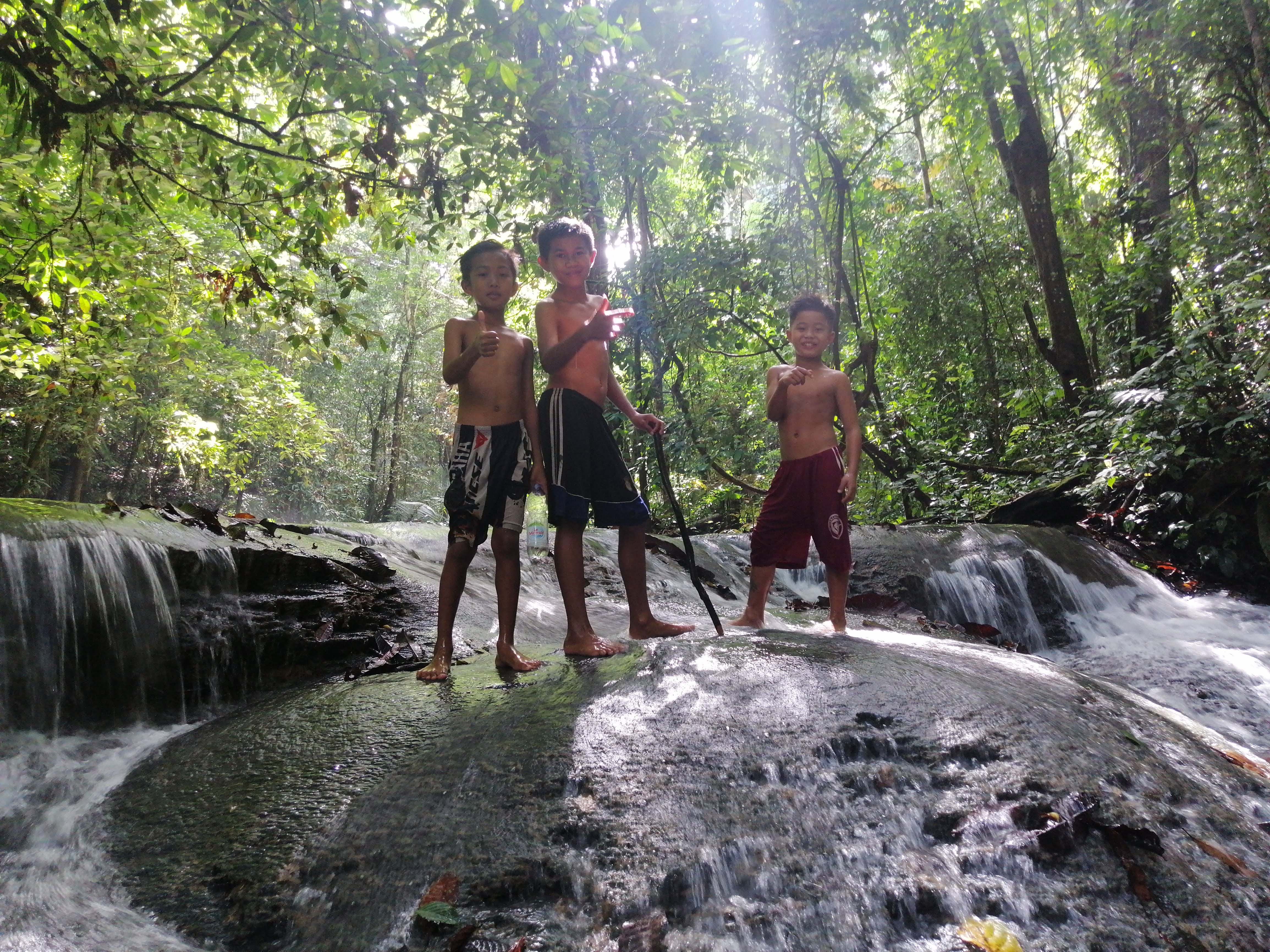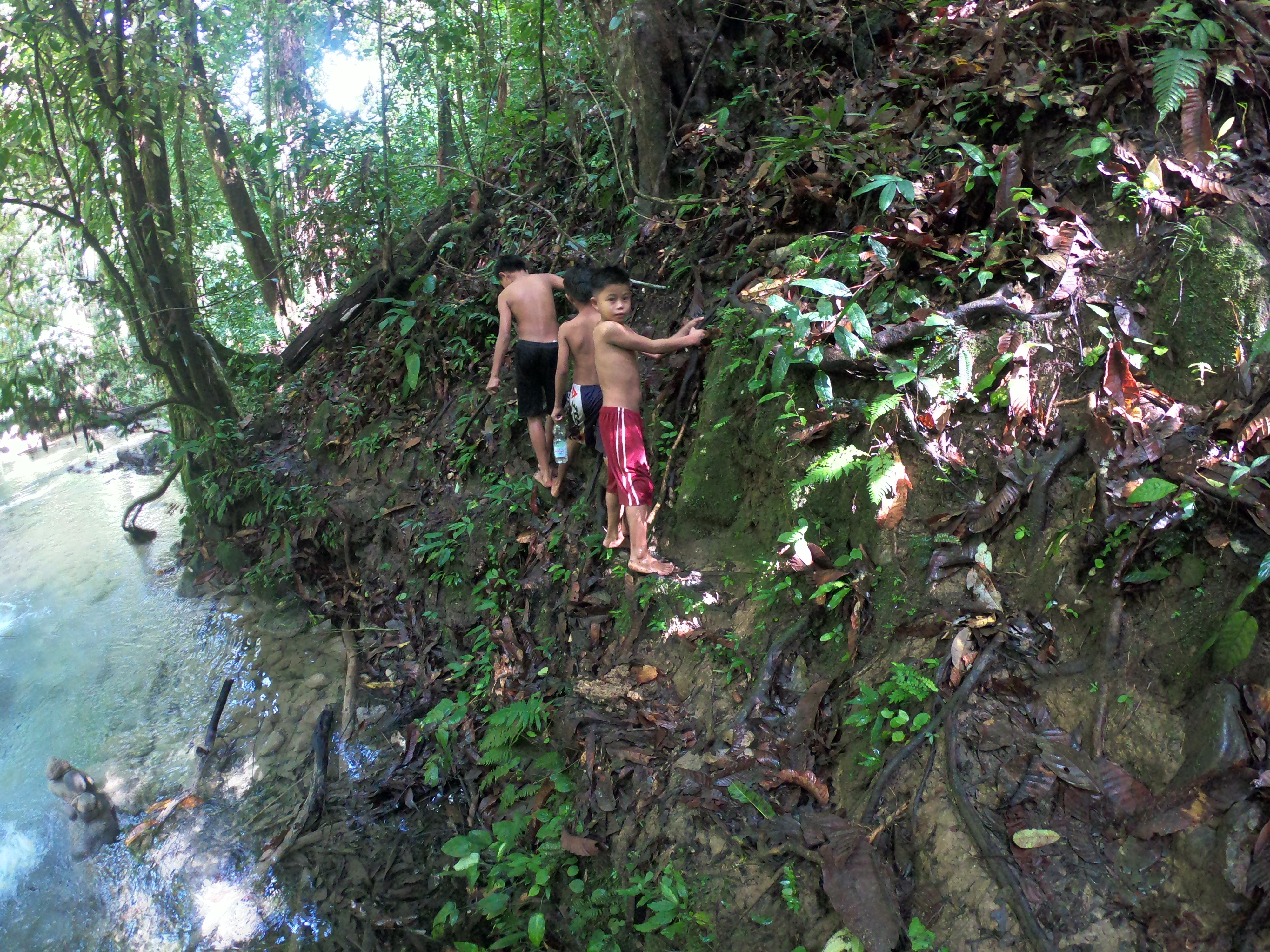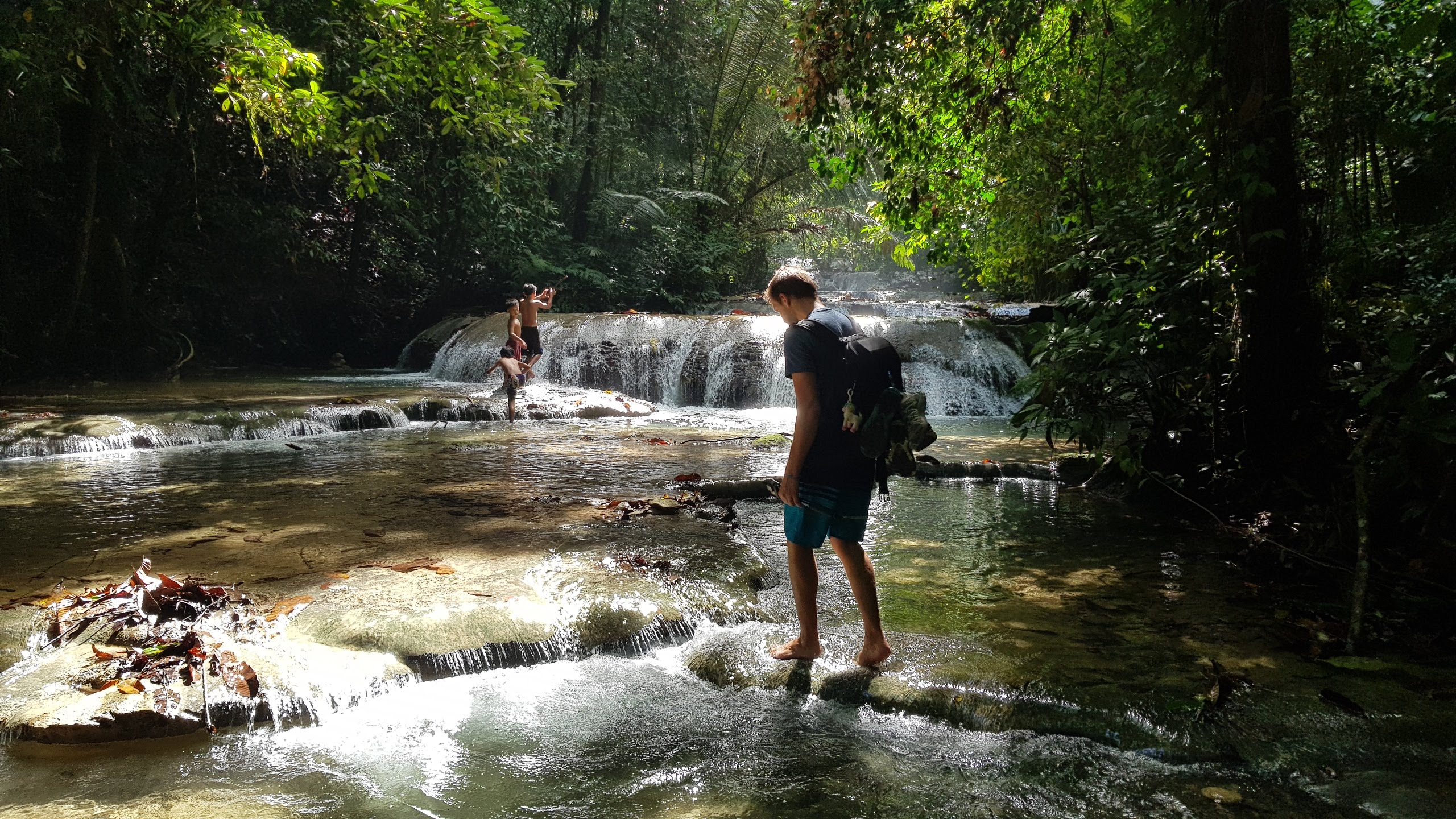 Le parc est bien aménagé mais complètement désert. Nous progressons le long de la cascade qui s’écoule sur les roches formant de magnifiques rideaux blanc. La cascade est fréquenté par 3 petits locaux qui grimpent à même la rivière. Après avoir croisé leur regard, ils nous rejoignent et nous servirons de guide pour remonter le cours d’eau. Tel de vrais petits guides, ils nous indiquent le meilleur chemin à suivre et bougent des roches ou des branches qui pourraient nous gêner. La rivière est en plein coeur de la jungle et le soleil transperçant la forêt vient illuminer le paysage. Nous redescendons ensuite la rivière marchant pied nu à travers la jungle comme de vrais locaux suivant toujours nos 3 petits guides. J’y ai pas coupé, j’ai marché sur une bestiole inconnu qui m’a piqué le pied !