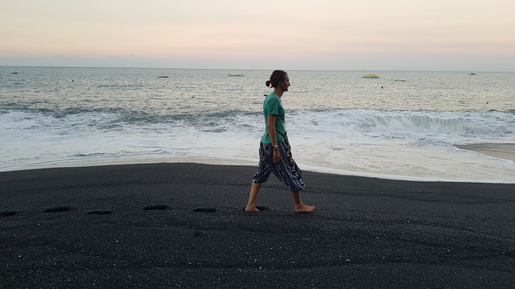 Nous découvrons alors la plage : une immense étendu de sable noir, des vagues qui se fracassent sur le sable, des dizaines de pirogues qui attendent qu’on les mette à l’eau, des familles posés tranquillement sur la plage, des chiens protégeant leur territoire et toujours des « Hello » qui sortent de nul part…