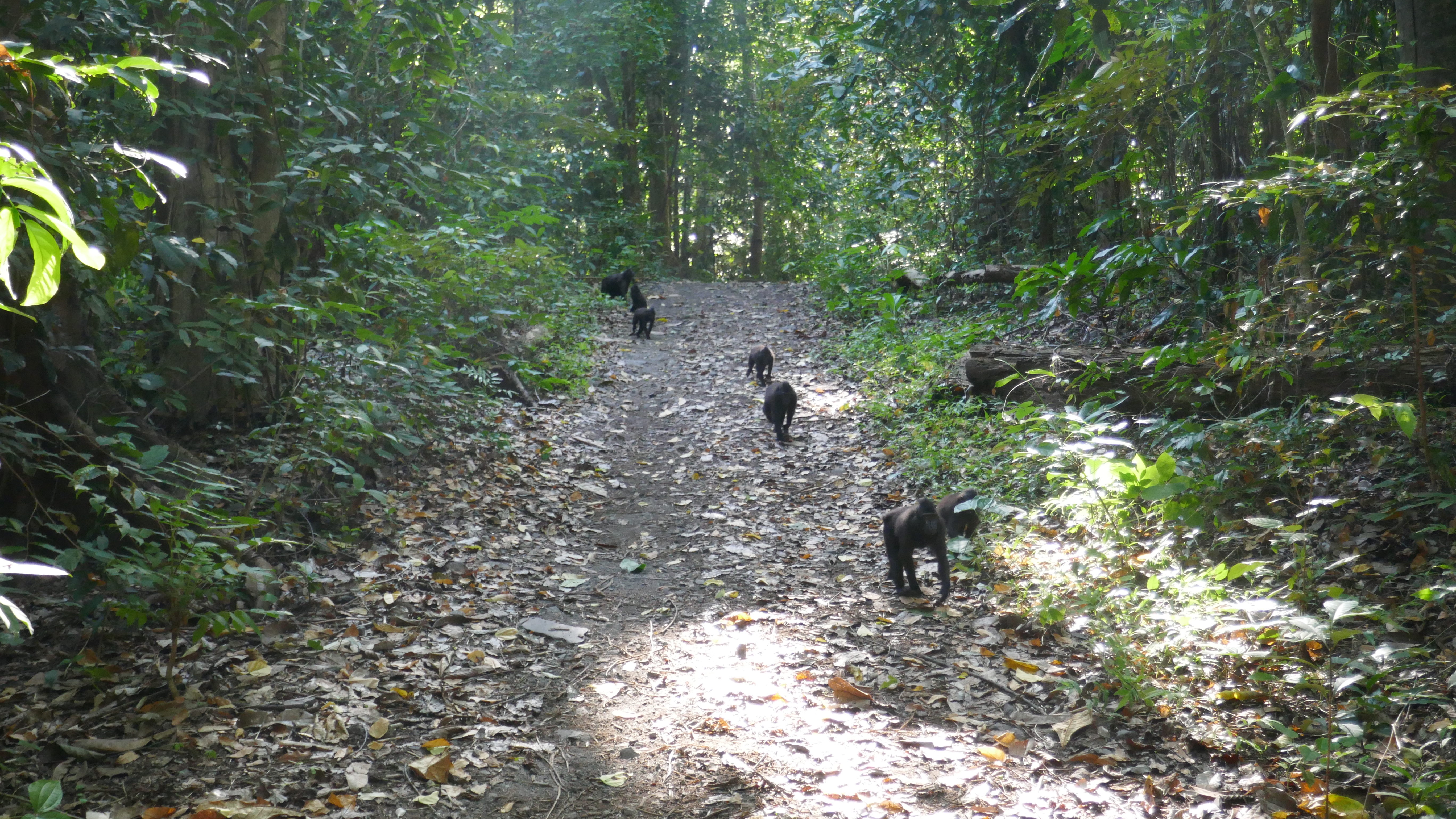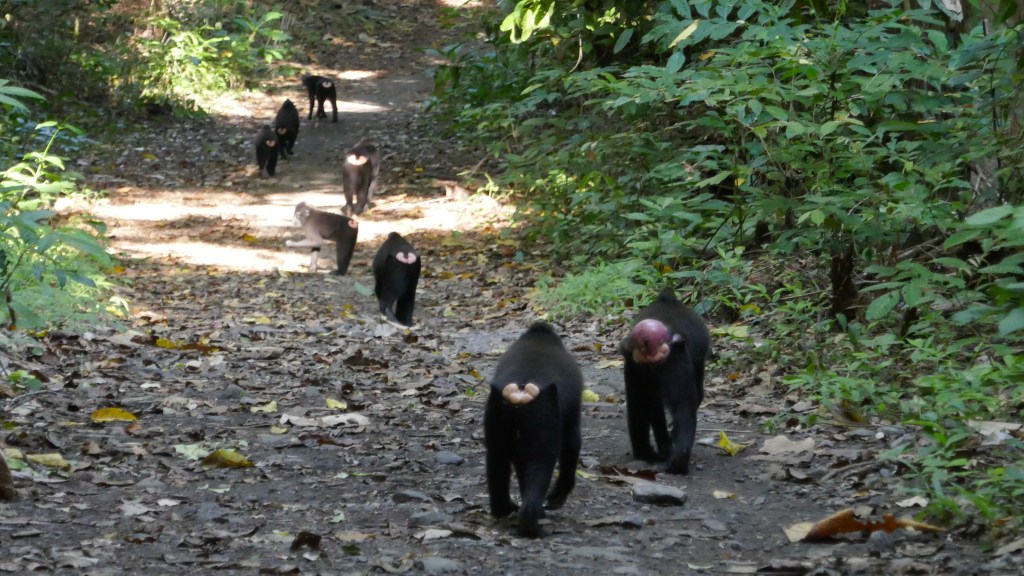 Pour nous réconforter sur le chemin du retour, nous apercevons à travers la végétation quelques singes. Nous sommes alors tout excités. Tout à coup, une horde de plusieurs dizaines de macaques à tête noir déboule de la forêt de toutes parts pour traverser et suivre le chemin devant nos yeux ébahis.