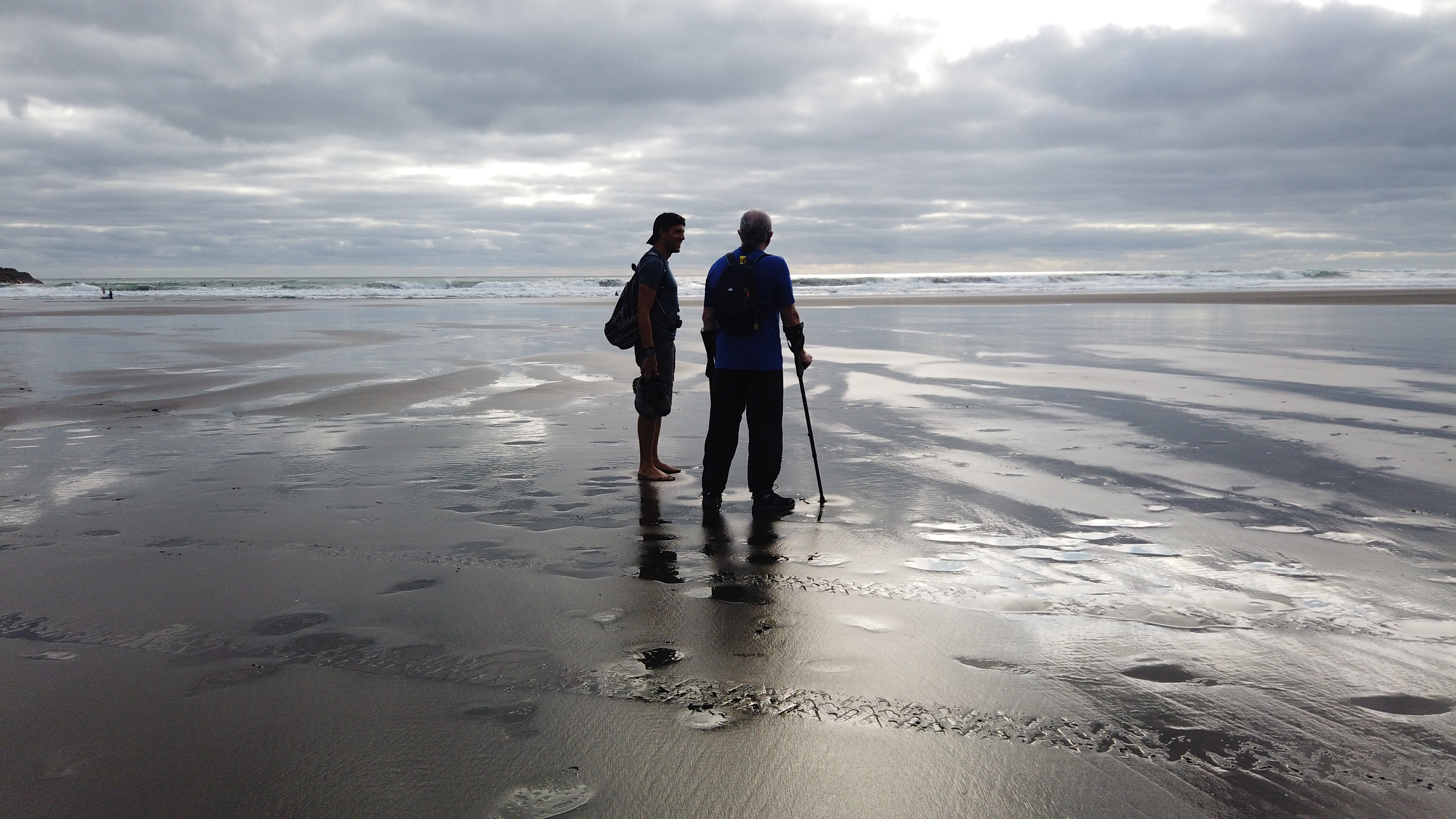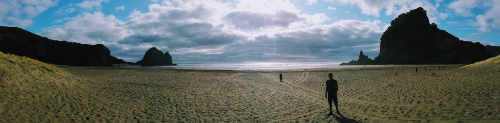 Nous reprenons la route pour rejoindre la Piha Beach, un peu plus au sud. Plage populaire d’Auckland à ce qu’on dit. Mais ici, populaire signifie quelques personnes répartis sur une plage immense, balade, baignade, surf… Une étendue de sable noir, une mer sans fin, et des roches comme posées là de part et d’autres pour embellir le paysage. La marrée basse et ses vagues laissent un filé d’eau sur le sable agissant comme un miroir faisant refléter parfaitement le ciel et les montagnes.