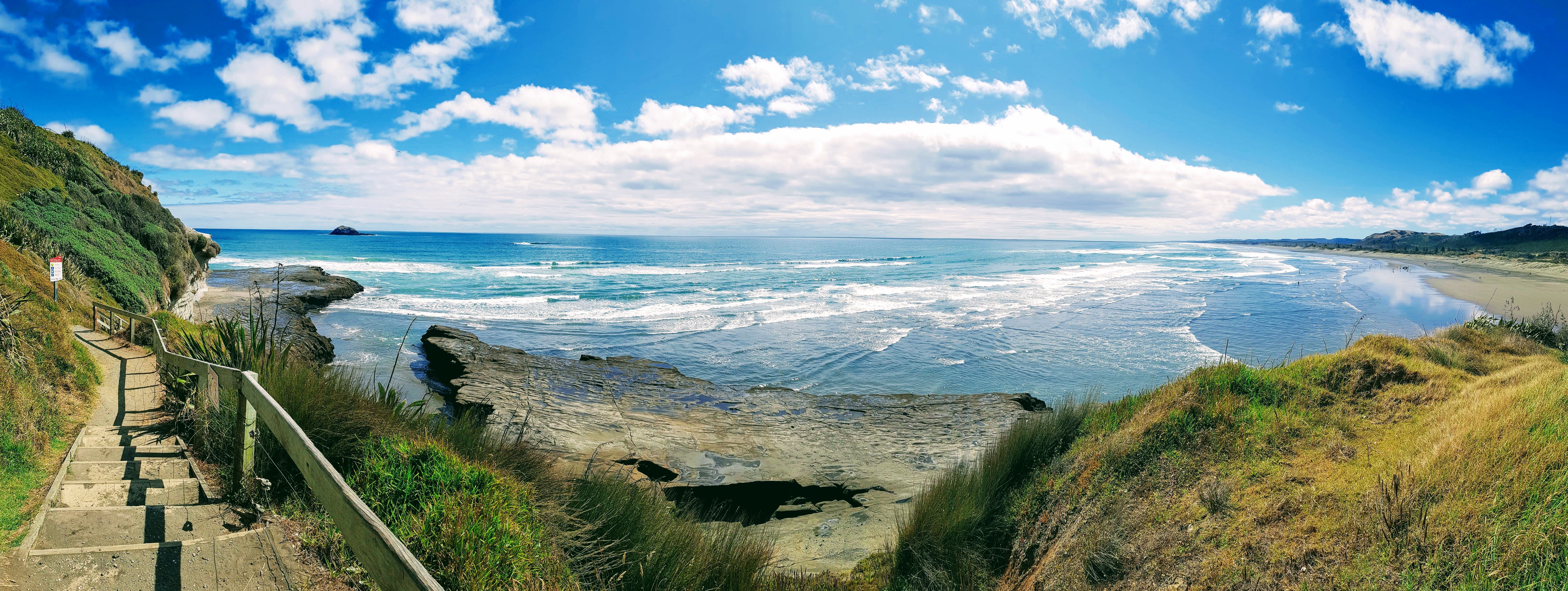 Première arrêt à Muriwai : une immense plage de sable noir, un océan de vagues incessantes et des surfeurs en pagailles. La mer de Tasman offre une eau avec un dégradé de bleu magnifique qui s’oppose aux falaises abruptes où viennent se briser les vagues.