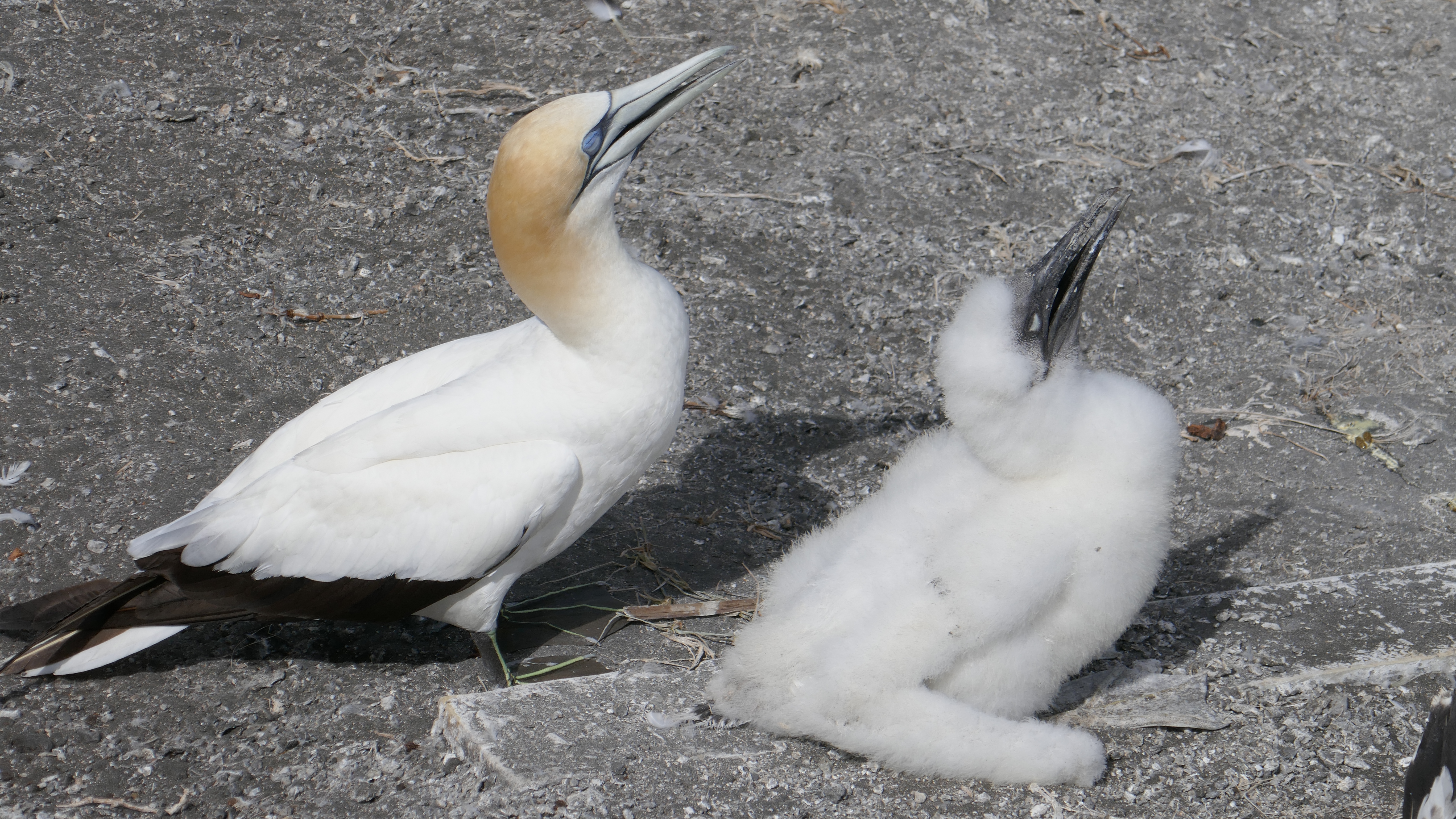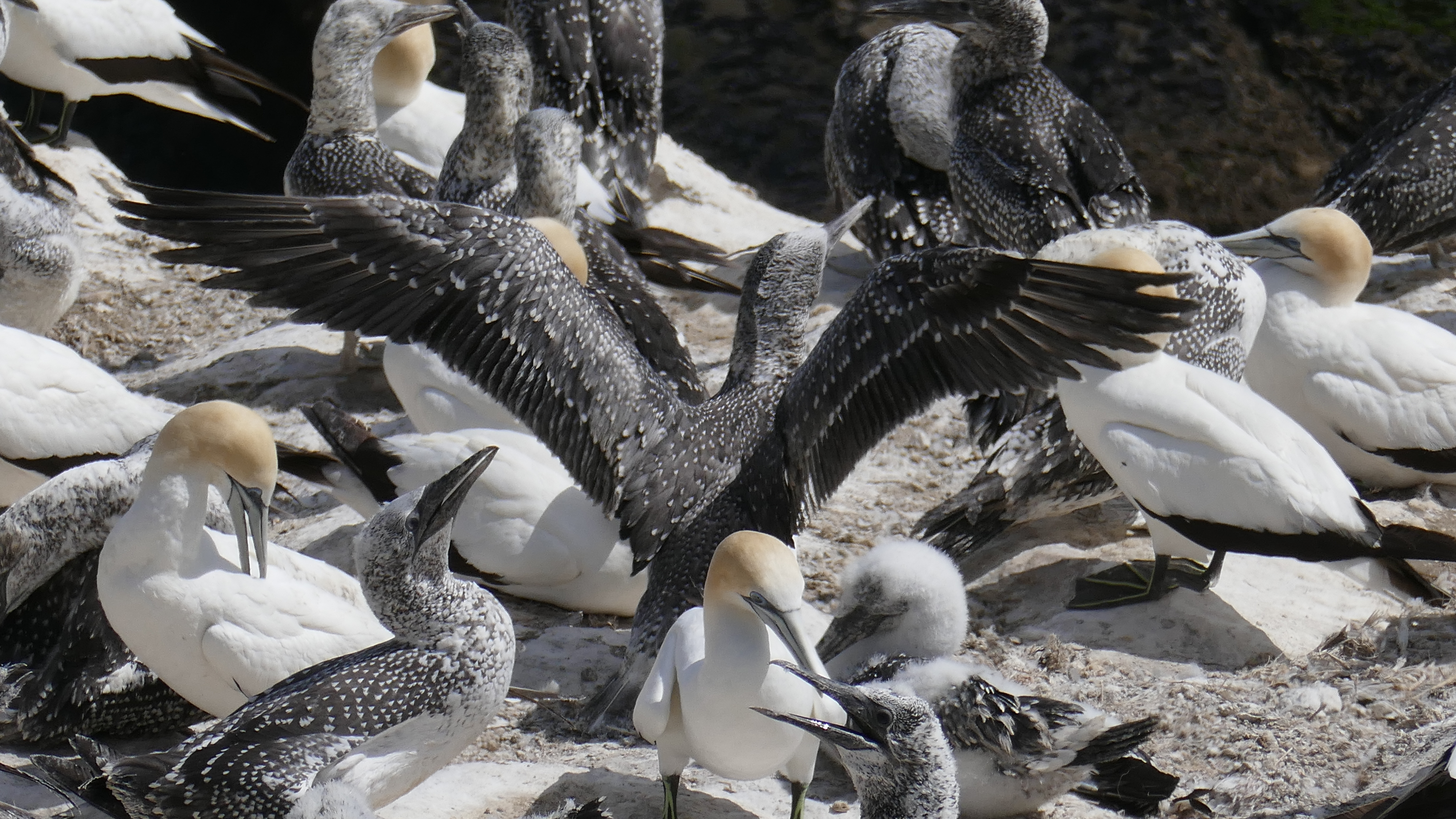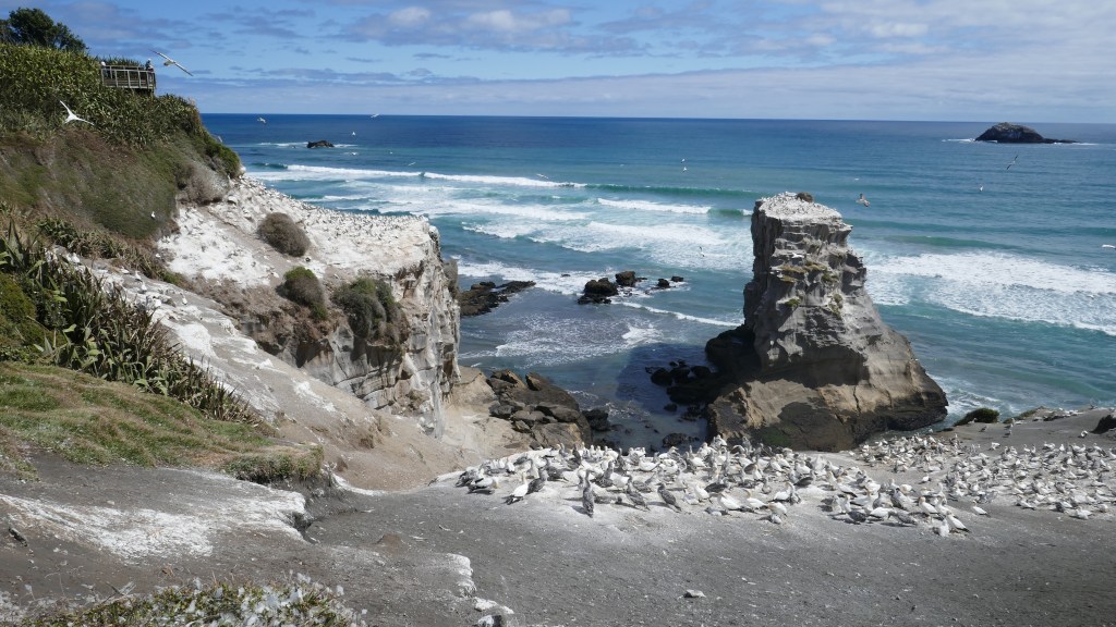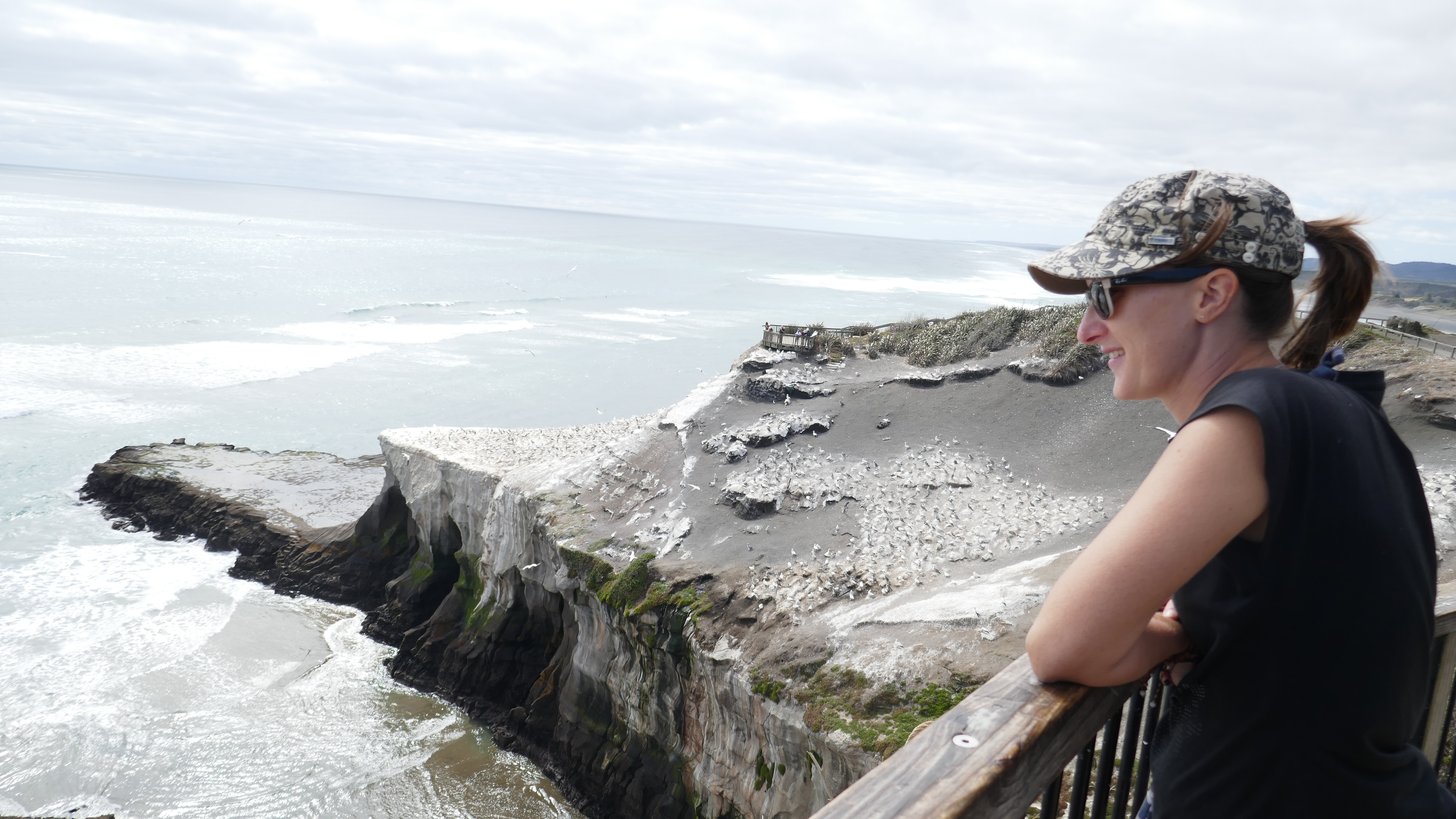 Nous suivons un petit sentier de randonnées qui longe la côte et monte jusqu’à un belvédère pour offrir un super point de vue. Nous apercevons quelques oiseaux ressemblant à des mouettes qui survolent les lieux. Nous nous empressons alors de nous approcher pour en capturer l’instant. A notre grande surprise, nous découvrons le lieu de villégiature de tout une nuée de Ganettes. Un rassemblement de plusieurs centaines d’oiseaux, posés là au sommet de la falaise de la Motutara Island. Nous pouvons les observer au plus près : mamans, papas, bébés, couvades, jeunes roucoulades et séances de drague, envols, survoles, les oiseaux prennent plaisir à jouer avec les vents. Tout ça au grand plaisir de Maman Brigitte.