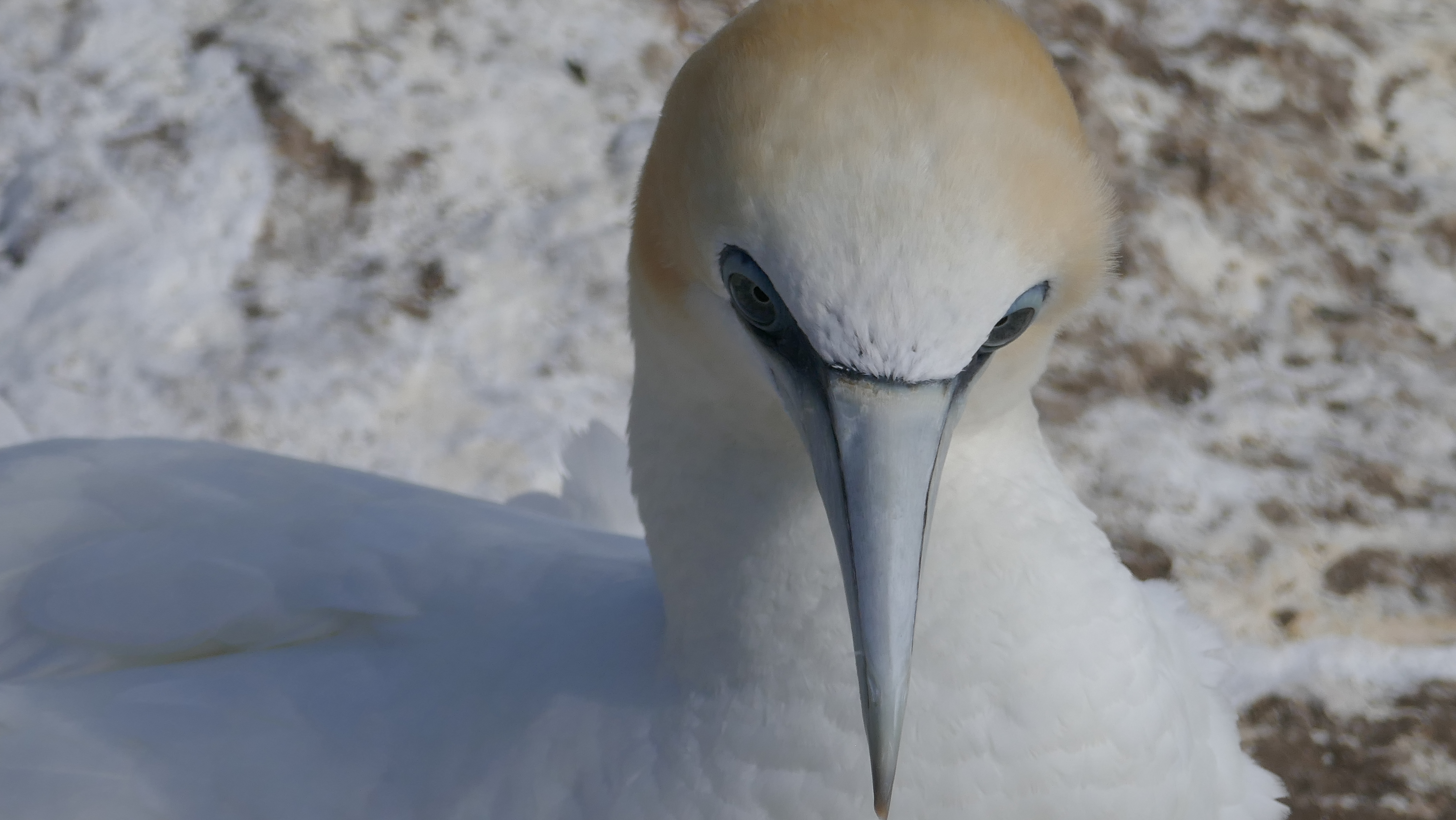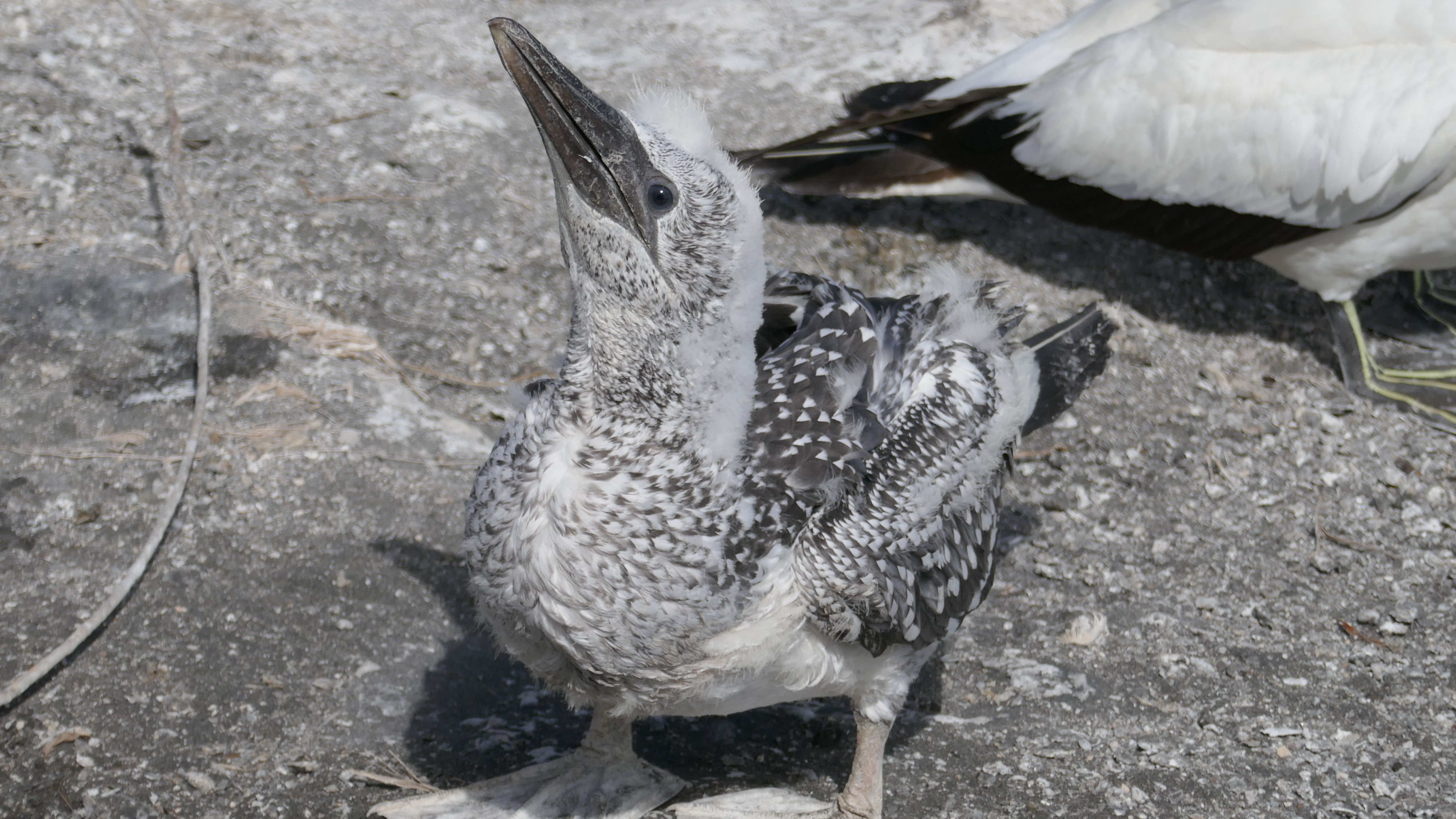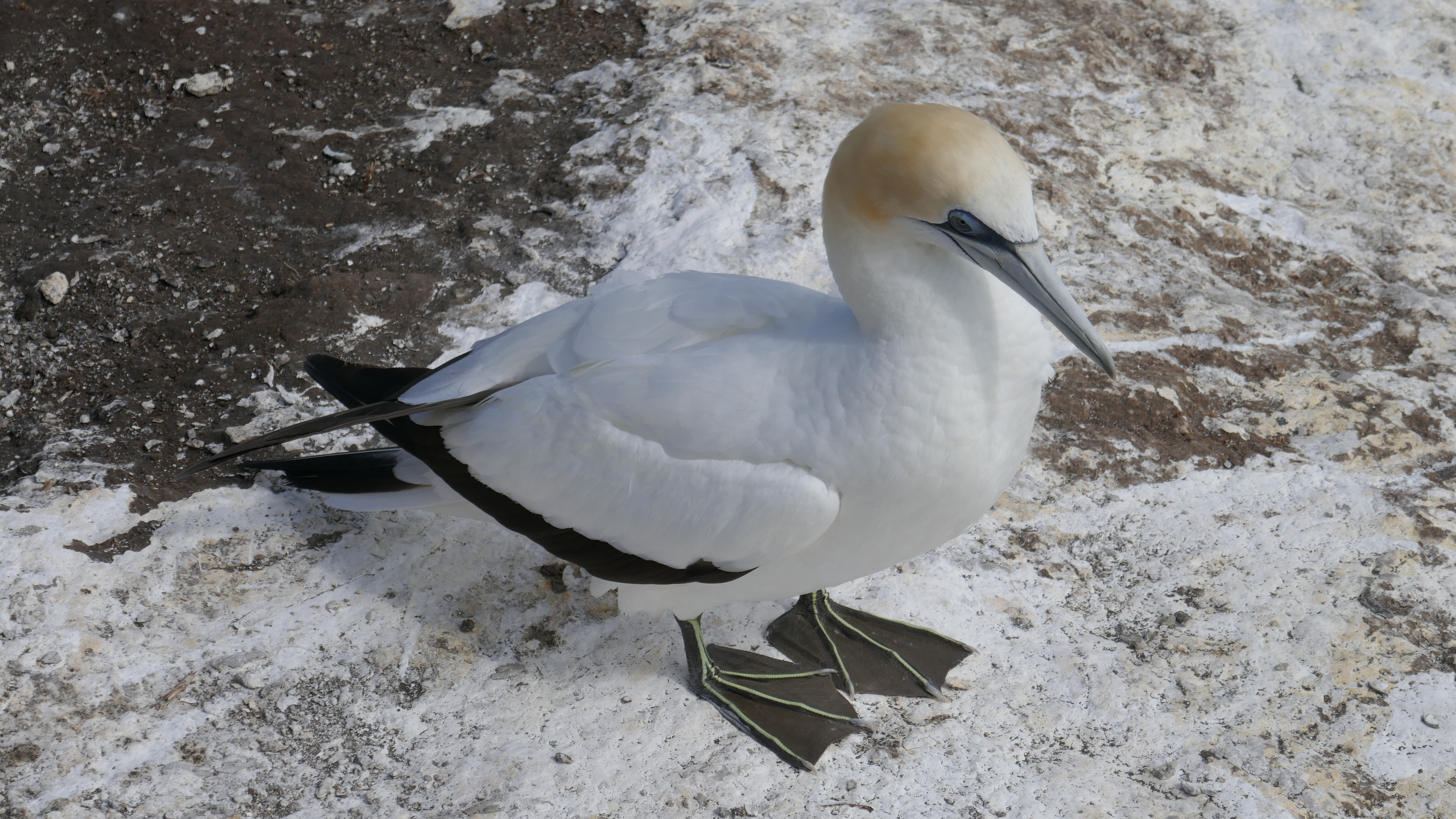 Nous suivons un petit sentier de randonnées qui longe la côte et monte jusqu’à un belvédère pour offrir un super point de vue. Nous apercevons quelques oiseaux ressemblant à des mouettes qui survolent les lieux. Nous nous empressons alors de nous approcher pour en capturer l’instant. A notre grande surprise, nous découvrons le lieu de villégiature de tout une nuée de Ganettes. Un rassemblement de plusieurs centaines d’oiseaux, posés là au sommet de la falaise de la Motutara Island. Nous pouvons les observer au plus près : mamans, papas, bébés, couvades, jeunes roucoulades et séances de drague, envols, survoles, les oiseaux prennent plaisir à jouer avec les vents. Tout ça au grand plaisir de Maman Brigitte.