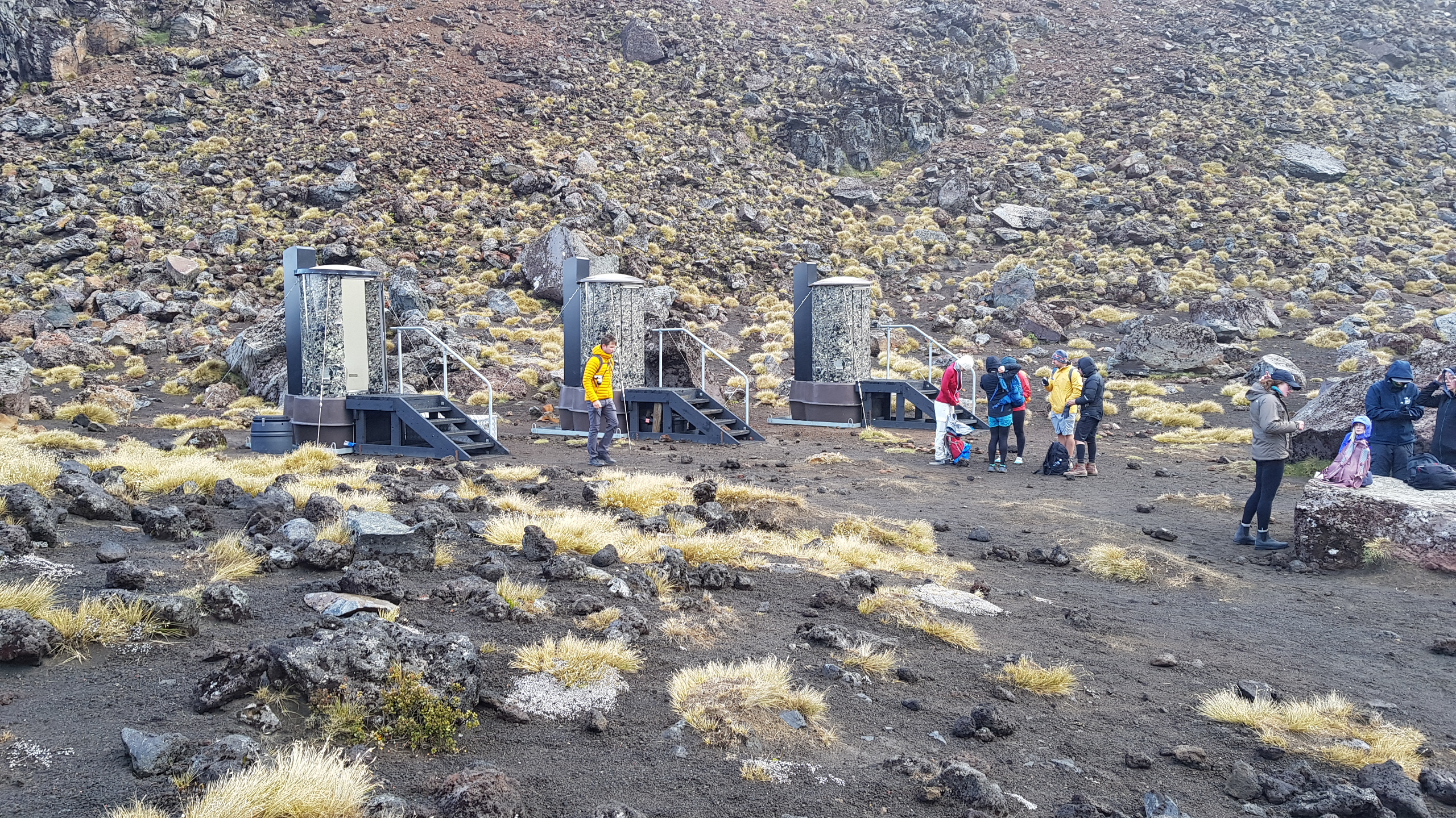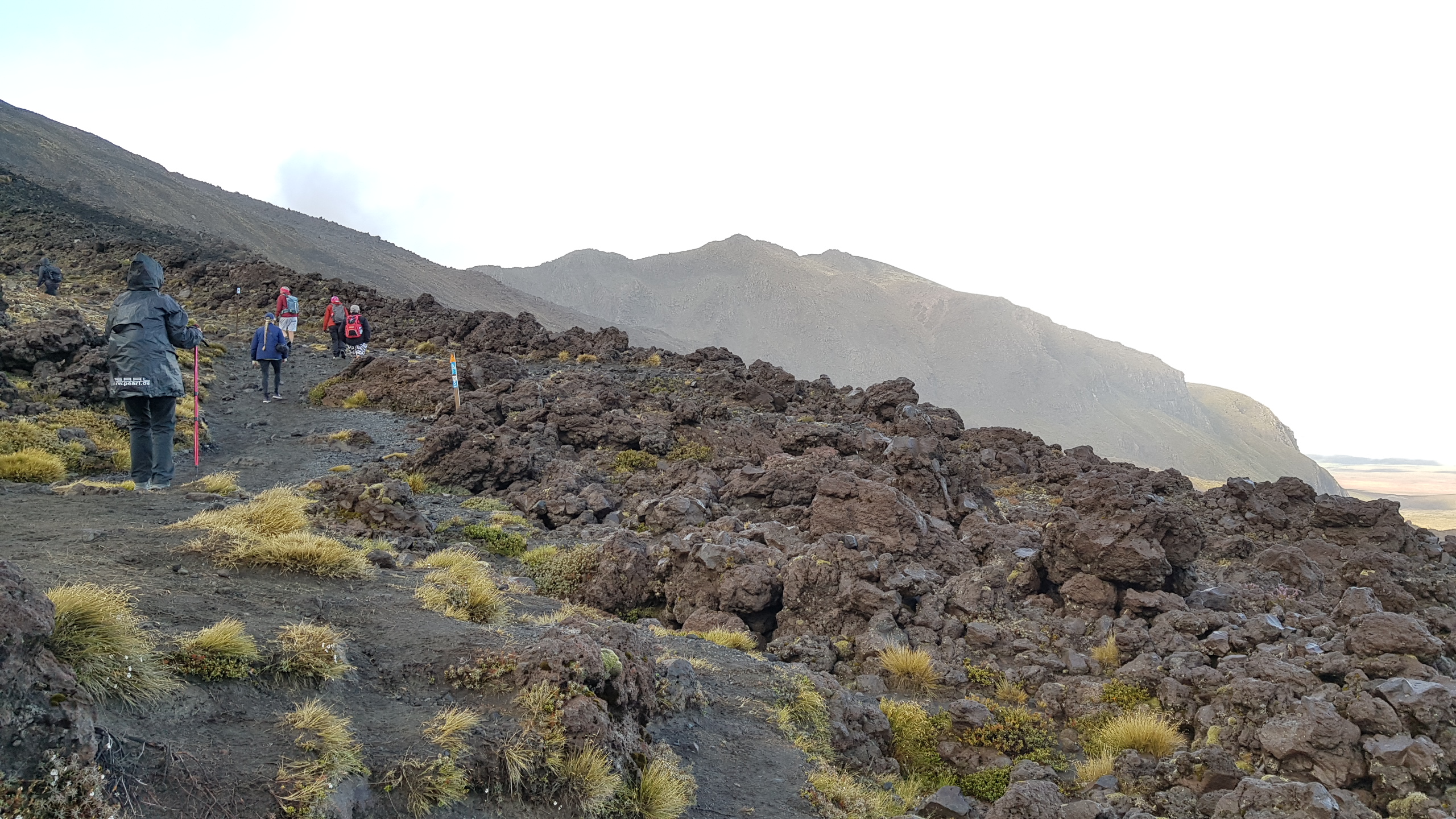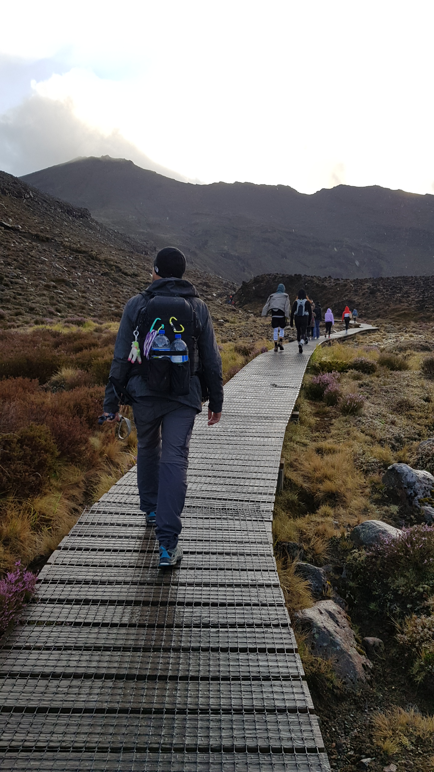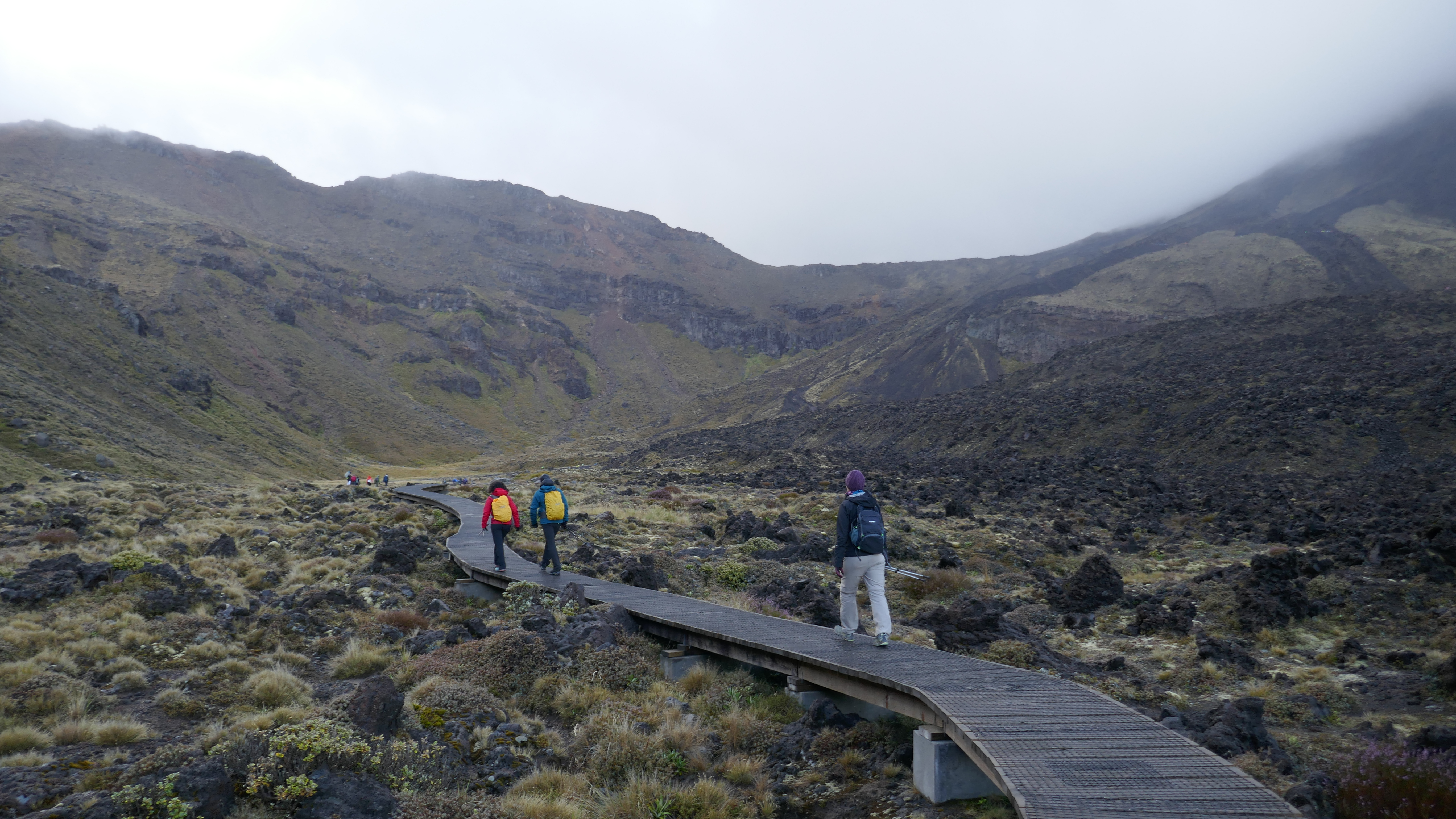 Comme tout en Nouvelle Zélande, l’aménagement est parfaitement organisé. Des caillebotis surélevés ont été placés pour former le chemin. Cela facilite grandement la progression, et rend la randonnée plus accessible. Cependant, on trouve que ça dénature aussi grandement le paysage et la nature des lieux. Il faut dire que la foule de marcheurs présente dénature également le coté sauvage du trek. Les randonneurs forment une immense chaine marchant les uns derrière les autres et visible sur des centaines de mètres. Impossible d’être en queue de fil pour prendre son temps tranquillement, puisqu’il y a toujours quelqu’un derrière. Quand tu t’arrêtes pour prendre une photo ou faire une pause, il faut regarder à droite et à gauche pour te réinsérer sur le sentier. Nous avons même eu droit à des bouchons dans les parties un peu difficiles.