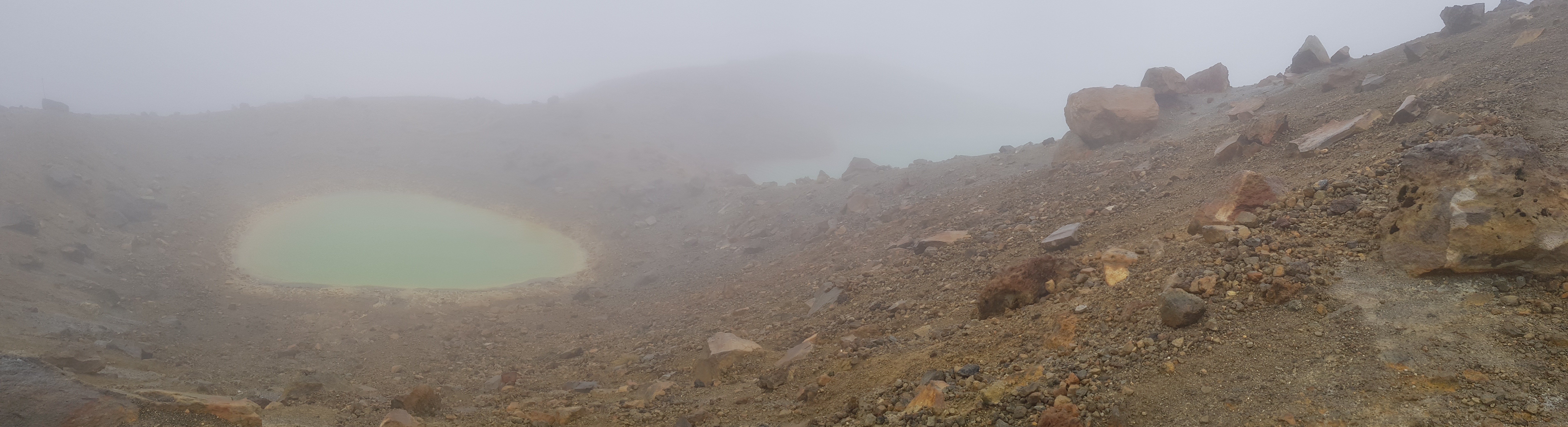 Nous ne profiterons pas plus longtemps du pano(rama) et entamons directement la descente. C’est alors que nous discernons difficilement les fameux lacs émeraudes effacés par une brume épaisse. Le chemin nous mêne au plus près de l’un d’eux que nous pouvons alors apercevoir mais la pluie frappant nos visages ne nous donne pas envie d’en profiter plus. Nos corps sont frigorifiés, nos vêtements trempés, nos mains gelées, nos chaussettes mouillées, … nous avons plutôt envie d’en terminer au plus vite.